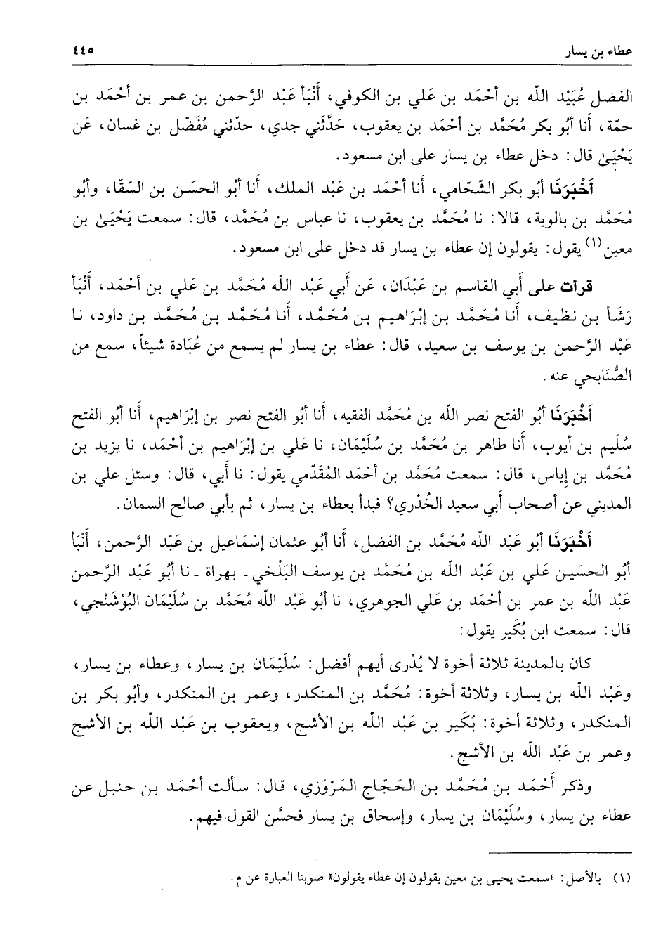 الفضل عبيد الله بن أحمد بن علي بن الكوفي أنبأ عبد الرحمن بن عمر بن أحمد بن حمة أنا أبو بكر محمد بن أحمد بن يعقوب حدثني جدي حدثني مفضل بن غسان عن يحيى قال دخل عطاء بن يسار على ابن مسعود أخبرنا أبو بكر الشحامي أنا أحمد بن عبد الملك أنا أبو الحسن بن السقا وأبو محمد بن بالوية قالا نا محمد بن يعقوب نا عباس بن محمد قال سمعت يحيى بن معين (1) يقول يقولون إن عطاء بن يسار قد دخل على ابن مسعود قرأت على أبي القاسم بن عبدان عن أبي عبد الله محمد بن علي بن أحمد أنبأ رشأ بن نظيف أنا محمد بن إبراهيم بن محمد أنا محمد بن محمد بن داود نا عبد الرحمن بن يوسف بن سعيد قال عطاء بن يسار لم يسمع من عبادة شيئا سمع من الصنابحي عنه أخبرنا أبو الفتح نصر الله بن محمد الفقيه أنا أبو الفتح نصر بن إبراهيم أنا أبو الفتح سليم بن أيوب أنا طاهر بن محمد بن سليمان نا علي بن إبراهيم بن أحمد نا يزيد بن محمد بن إياس قال سمعت محمد بن أحمد المقدمي يقول نا أبي قال وسئل علي بن المديني عن أصحاب أبي سعيد الخدري فبدأ بعطاء بن يسار ثم بأبي صالح السمان أخبرنا أبو عبد الله محمد بن الفضل أنا أبو عثمان إسماعيل بن عبد الرحمن أنبأ أبو الحسين علي بن عبد الله بن محمد بن يوسف البلخي بهراة نا أبو عبد الرحمن عبد الله بن عمر بن أحمد بن علي الجوهري أنا أبو عبد الله محمد بن سليمان البوشنجي قال سمعت ابن بكير يقول كان بالمدينة ثلاثة أخوة لا يدرى أيهم أفضل سليمان بن يسار وعطاء بن يسار وعبد الله بن يسار وثلاثة أخوة محمد بن المنكدر وعمر بن المنكدر وأبو بكر بن المنكدر وثلاثة أخوة بكير بن عبد الله بن الأشج ويعقوب بن عبد الله بن الأشج وعمر بن عبد الله بن الأشج وذكر أحمد بن محمد بن الحجاج المروزي قال سألت أحمد بن حنبل عن عطاء بن يسار وسليمان بن يسار وإسحاق بن يسار فحسن القول فيهم