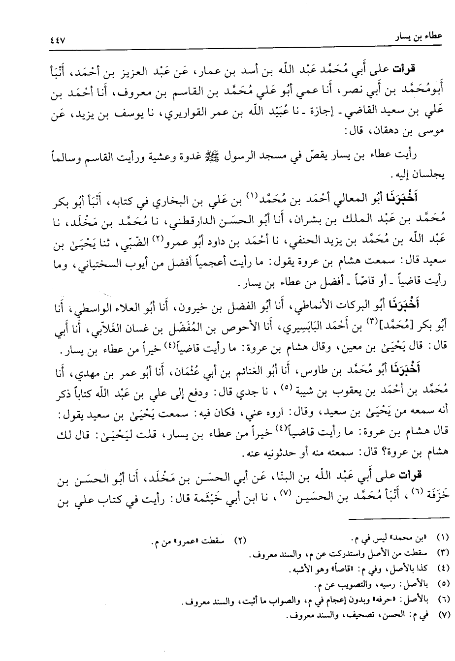 قرأت على أبي محمد عبد الله بن أسد بن عمار عن عبد العزيز بن أحمد أنبأ أبو محمد بن أبي نصر أنا عمي أبو علي محمد بن القاسم بن معروف أنا أحمد بن علي بن سعيد القاضي إجازة نا عبيد الله بن عمر القواريري نا يوسف بن يزيد عن موسى بن دهقان قال رأيت عطاء بن يسار يقص في مسجد الرسول (صلى الله عليه وسلم) غدوة وعشية ورأيت القاسم وسالما يجلسان إليه أخبرنا أبو المعالي أحمد بن محمد (1) بن علي بن البخاري في كتابه أنبأ أبو بكر محمد بن عبد الملك بن بشران أنا أبو الحسن الدارقطني نا محمد بن مخلد نا عبد الله بن محمد بن يزيد الحنفي نا أحمد بن داود أبو عمرو (2) الضبي ثنا يحيى بن سعيد قال سمعت هشام بن عروة يقول ما رأيت أعجميا أفضل من أيوب السختياني وما رأيت قاضيا أو قاصا أفضل من عطاء بن يسار أخبرنا أبو البركات الأنماطي أنا أبو الفضل بن خيرون أنا أبو العلاء الواسطي أنا أبو بكر محمد (3) بن أحمد البابسيري أنا الأحوص بن المفضل بن غسان الغلابي أنا أبي قال قال يحيى بن معين وقال هشام بن عروة ما رأيت قاضيا (4) خيرا من عطاء بن يسار أخبرنا أبو محمد بن طاوس أنا أبو الغنائم بن أبي عثمان أنا أبو عمر بن مهدي أنا محمد بن أحمد بن يعقوب بن شيبة (5) نا جدي قال ودفع إلى علي بن عبد الله كتابا ذكر أنه سمعه من يحيى بن سعيد وقال اروه عني فكان فيه سمعت يحيى بن سعيد يقول قال هشام بن عروة ما رأيت قاضيا (4) خيرا من عطاء بن يسار قلت ليحيى قال لك هشام بن عروة قال سمعته منه أو حدثونيه عنه قرأت على أبي عبد الله بن البنا عن أبي الحسن بن مخلد أنا أبو الحسن بن خزفة (6) أنبأ محمد بن الحسين (7) نا ابن أبي خيثمة قال رأيت في كتاب علي بن