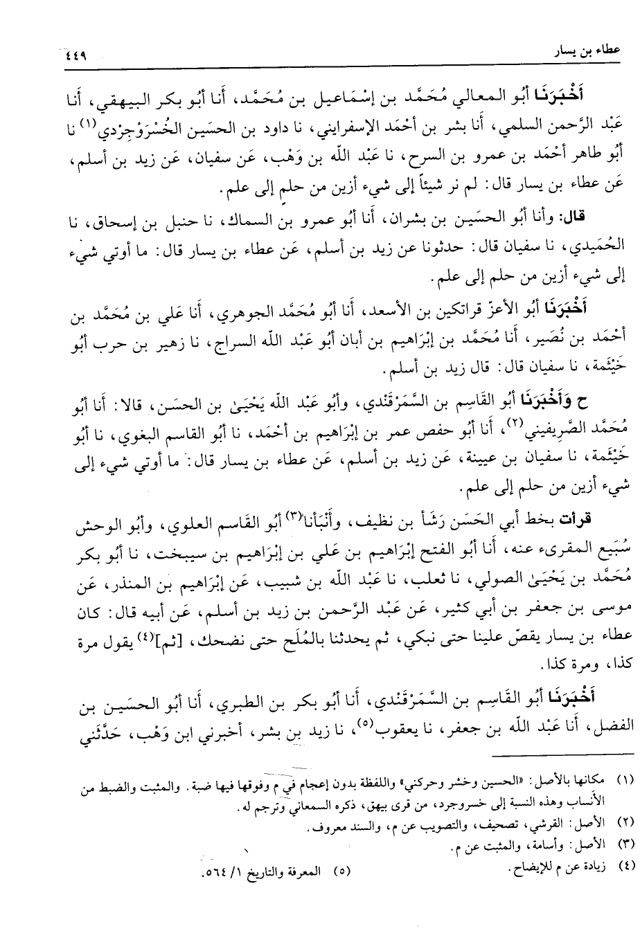 أخبرنا أبو المعالي محمد بن إسماعيل بن محمد أنا أبو بكر البيهقي نا عبد الرحمن السلمي أنا بشر بن أحمد الإسفرايني نا داود بن الحسين الخسروجردي (1) نا أبو طاهر أحمد بن عمرو بن السرح نا عبد الله بن وهب عن سفيان عن زيد بن أسلم عن عطاء بن يسار قال لم نر شيئا إلى شئ أزين من حلم إلى علم قال وأنا أبو الحسين بن بشران أنا أبو عمرو بن السماك نا حنبل بن إسحاق نا الحميدي نا سفيان قال حدثونا عن زيد بن أسلم عن عطاء بن يسار قال ما أوتي شئ إلى شئ أزين من حلم إلى علم أخبرنا أبو الأعز قراتكين بن الأسعد أنا أبو محمد الجوهري أنا علي بن محمد بن أحمد بن نصير أنا محمد بن إبراهيم بن أبان أبو عبد الله السراج نا زهير بن حرب أبو خيثمة نا سفيان قال قال زيد بن أسلم ح وأخبرنا أبو القاسم بن السمرقندي وأبو عبد الله يحيى بن الحسن قالا أنا أبو محمد الصريفيني (2) أنا أبو حفص عمر بن إبراهيم بن أحمد أبو القاسم البغوي نا أبو خيثمة نا سفيان بن عيينة عن زيد بن أسلم عن عطاء بن يسار قال ما أوتي شئ إلى شئ أزين من حلم إلى علم قرأت بخط أبي الحسن رشأ بن نظيف وأنبأنا (3) أبو القاسم العلوي وأبو الوحش سبيع المقرئ عنه أنا أبو الفتح إبراهيم بن علي بن إبراهيم بن سيبخت نا أبو بكر محمد بن يحيى الصولي نا ثعلب نا عبد الله بن شبيب عن إبراهيم بن المنذر عن موسى بن جعفر بن أبي كثير عن عبد الرحمن بن زيد بن أسلم عن أبيه قال كان عطاء بن يسار يقص علينا حتى نبكي ثم يحدثنا بالملح حتى نضحك ثم (4) يقول مرة كذا ومرة كذا أخبرنا أبو القاسم بن السمرقندي أنا أبو بكر بن الطبري أنا أبو الحسين بن الفضل أنا عبد الله بن جعفر نا يعقوب (5) نا زيد بن بشر أخبرني ابن وهب حدثني