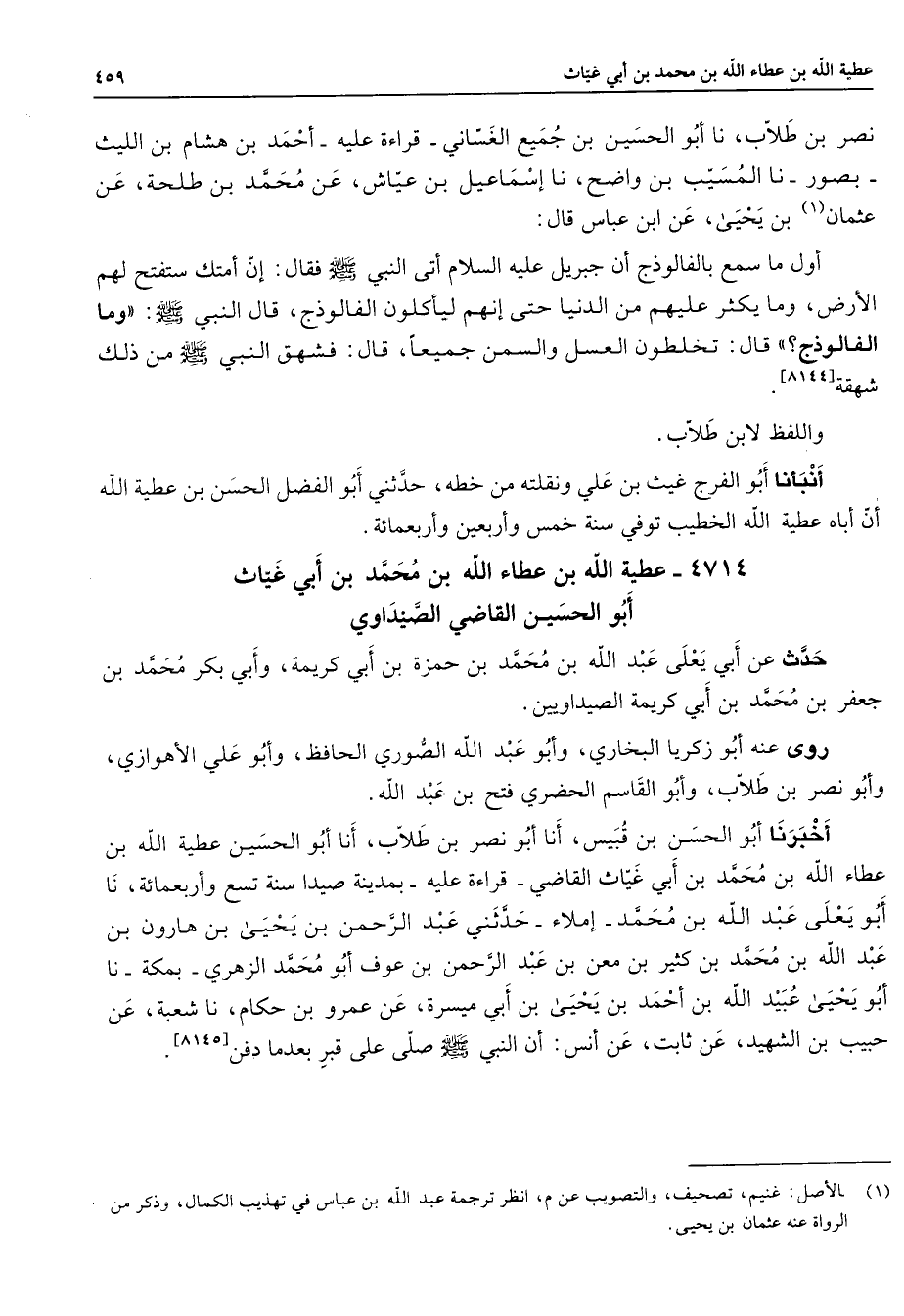 أبو نصربن طلاب نا أبو الحسين بن جميع الغساني قراءة عليه أحمد بن هشام بن الليث بصور نا المسيب بن واضح نا إسماعيل بن عياش عن محمد بن طلحة عن عثمان (1) بن يحيى عن ابن عباس قال أول ما سمع بالفالوذج أن جبريل عليه السلام أتى النبي (صلى الله عليه وسلم) فقال إن أمتك ستفتح لهم الأرض وما يكثر عليهم من الدنيا حتى أنهم ليأكلون الفالوذج قال النبي (صلى الله عليه وسلم) وما الفالوذج قال تخلطون العسل والسمن جميعا قال فشهق النبي (صلى الله عليه وسلم) من ذلك شهقة