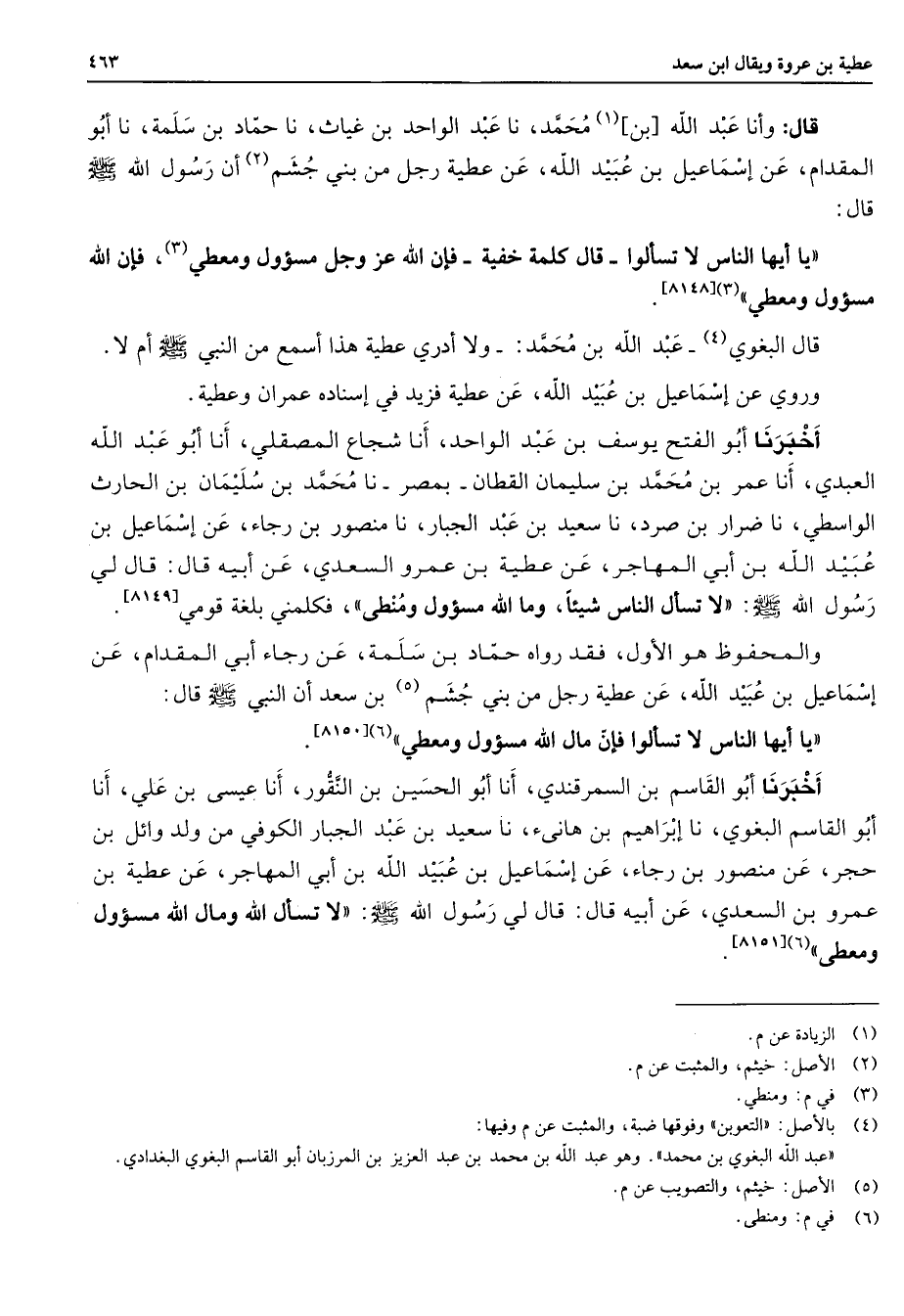 [8149] والمحفوظ هو الأول فقد رواه حماد بن سلمة عن رجاء أبي المقدام عن إسماعيل بن عبيد الله عن عطية رجل من بني جشم (5) بن سعد أن النبي (صلى الله عليه وسلم) قال يا أيها الناس لا تسألوا فإن مال الله مسؤول ومعطي