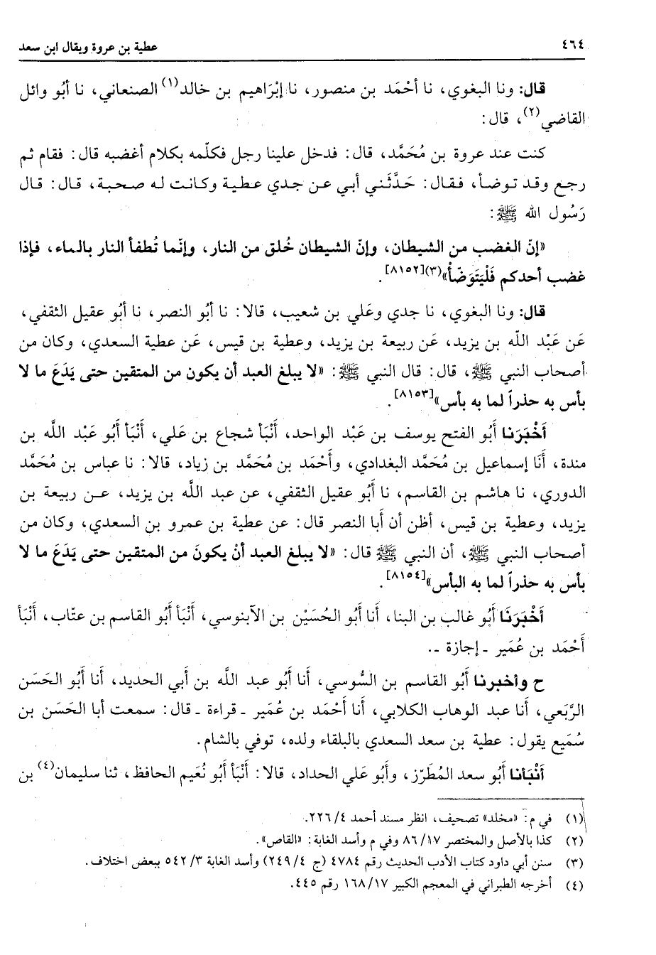 قال ونا البغوي نا أحمد بن منصور نا إبراهيم بن خالد (1) الصنعاني نا أبو وائل القاضي (2) قال كنت عند عروة بن محمد قال فدخل علينا رجل فكلمه بكلام أغضبه قال فقام ثم رجع ثم توضأ فقال حدثني أبي عن جدي عطية وكانت له صحبة قال قال رسول الله (صلى الله عليه وسلم) إن الغضب من الشيطان وإن الشيطان خلق من النار وإنما تطفأ النار بالماء فإذا غضب أحدكم فليتوضا