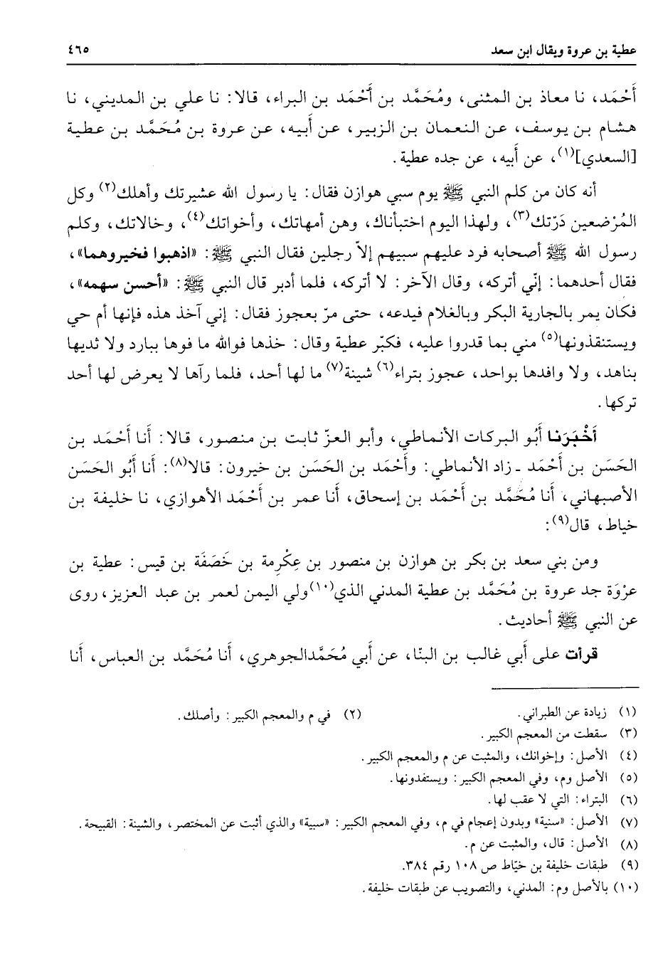 أحمد أنا معاذ بن المثنى ومحمد بن أحمد بن البراء قالانا علي بن المديني نا هشام بن يوسف عن النعمان بن الزبير عن أبيه عن عروة بن محمد بن عطية السعدي (1) عن أبيه عن جده عطية أنه كان من كلم النبي (صلى الله عليه وسلم) يوم سبي هوزان فقال يا رسول الله عشيرتك وأهلك (2) وكل المرضعين درتك (3) ولهذا اليوم اختبأناك وهن أمهاتك وأخواتك (4) وخالاتك وكلم رسول الله (صلى الله عليه وسلم) أصحابه فرد عليهم سبيهم إلا رجلين فقال النبي (صلى الله عليه وسلم) اذهبوا فخيروهما فقال أحدهما إني أتركه وقال الآخر لا أتركه فلما أدبر قال النبي (صلى الله عليه وسلم) أحسن سهمه فكان يمر بالجارية البكر وبالغلام فيدعه حتى مر بعجوز فقال إني آخذ هذه فإنها أم هي ويستنقذونها (5) مني بما قدروا عليه فكبر عطية وقال خذها فوالله ما فوها ببارد ولا ثديها بناهد ولا وافدها بواحد عجوز بتراء (6) شينة (7) ما لها من أحد فلما رآها لا يعرض لها أحد تركها أخبرنا أبو البركات الأنماطي وأبو العز ثابت بن منصور قالا أنا أحمد بن الحسن بن أحمد زاد الأنماطي وأحمد بن الحسن بن خيرون قالا (8) أنا أبو الحسن الأصبهاني أنا محمد بن أحمد بن إسحاق أنا عمر بن أحمد الأهوازي نا خليفة بن خياط قال (9) ومن بني سعد بن بكر بن هوزان بن منصور بن عكرمة بن خصفة بن قيس عطية بن عروة جد عروة بن محمد بن عطية المدني الذي (10) ولي اليمن لعمر بن عبد العزيز روى عن النبي (صلى الله عليه وسلم) أحاديث قرأت على أبي غالب بن البنا عن أبي محمد الجوهري أنا محمد بن العباس أنا