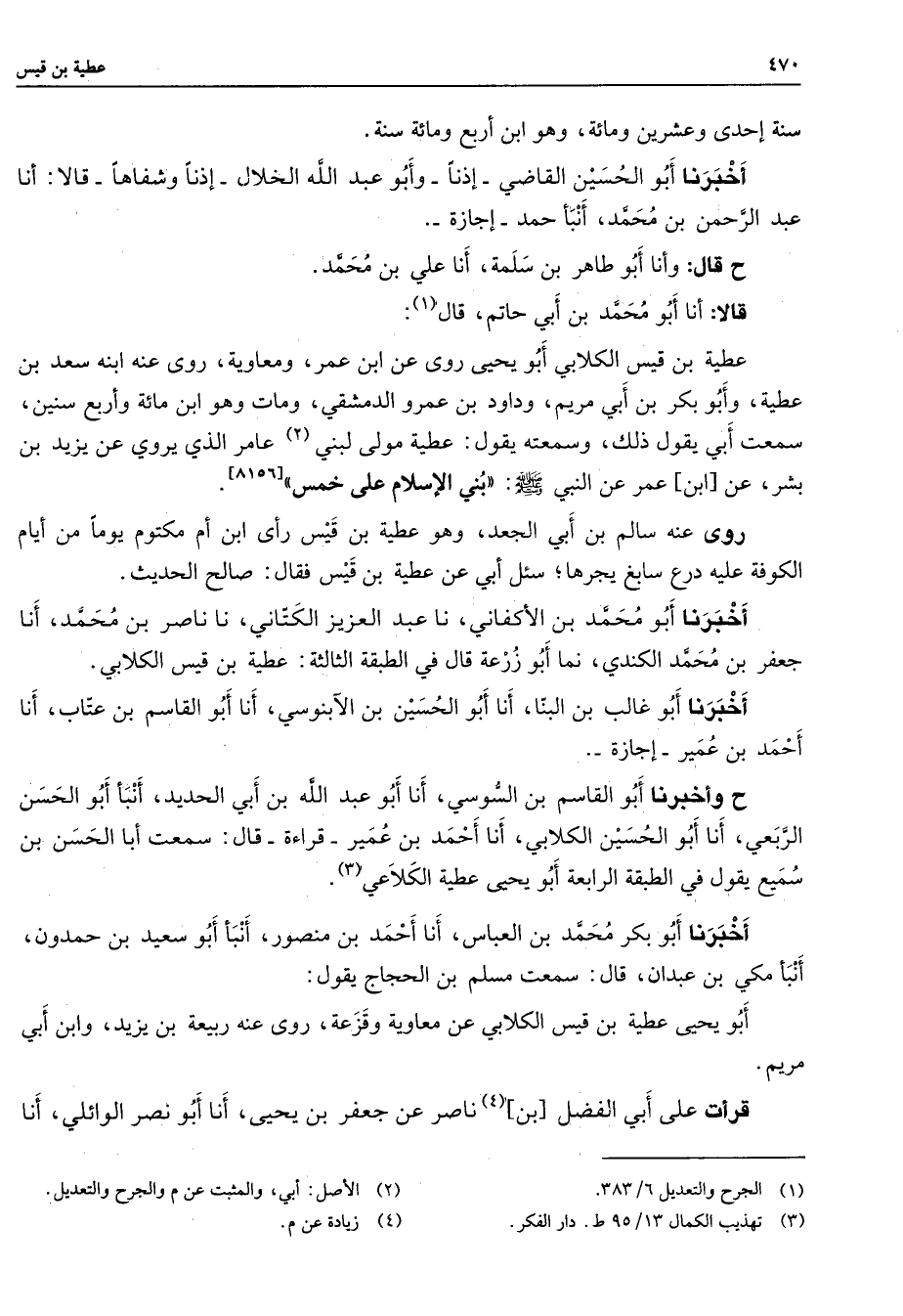 سنة إحدى وعشرين ومائة وهو ابن أربع ومائه سنة أخبرنا أبو الحسين القاضي إذنا وأبو عبد الله الخلال إذنا وشفاها قالا أنا عبد الرحمن بن محمد أنبأ حمد إجازة ح قال وأنا أبو طاهر بن سلمة أنا علي بن محمد قالا أنا أبو محمد بن أبي حاتم قال (1) عطية بن قيس الكلابي أبو يحيى روى عنه ابن عمر ومعاوية روى عنه ابنه سعد بن عطية وأبو بكر بن أبي مريم وداود بن عمرو الدمشقي ومات وهو ابن مائة وأربع سنين سمعت أبي يقول ذلك وسمعته يقول عطية مولى لبني (2) عامر الذي يروي عن يزيد بن بشر عن ابن عمر عن النبي (صلى الله عليه وسلم) بني الإسلام على خمس