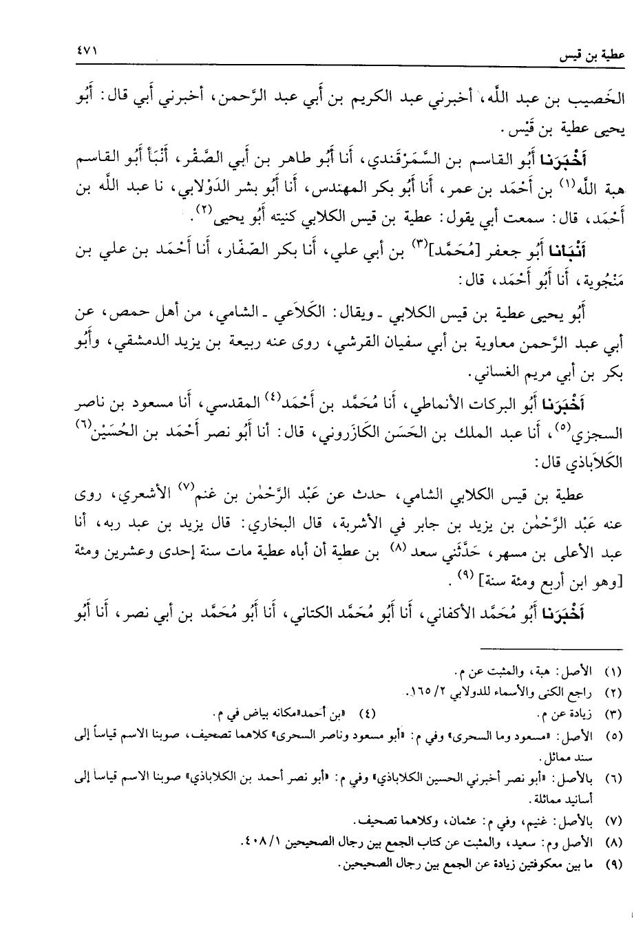 الخصيب بن عبد الله أخبرني عبد الكريم بن أبي عبد الرحمن أخبرني ابي قا أبو يحيى عطية بن قيس أخبرنا أبو القاسم بن السمرقندي أنا أبو طاهر بن أبي الصقر أنبأ أبو القاسم هبة الله (1) بن أحمد بن عمر أنا أبو بكر المهندس أنا أبو بشر الدولابي نا عبد الله بن أحمد قال سمعت أبي يقول عطية بن قيس الكلابي كنيته أبو يحيى (2) أنبأنا أبو جعفر محمد (3) بن أبي علي أنا بكر الصفار أنا أحمد بن علي بن منجوية أنا أبو أحمد قال أبو يحيى عطية بن قيس الكلابي الشامي ويقال الكلاعي الشامي من أهل حمص عن أبي عبد الرحمن معاوية بن أبي سفيان القرشي روى عنه ربيعة بن يزيد الدمشقي وأبو بكر بن ابي مريم الغساني أخبرنا أبو الببركات الأنماطي أنا محمد بن أحمد (4) المقدسي أنا مسعود بن ناصر السجزي (5) أنا عبد الملك بن الحسن الكازروني قال أنا أبو نصر أحمد بن الحسين (6) الكلاباذي قال عطية بن قيس الكلابي الشامي حدث عن عبد الرحمن بن غنم (7) الأشعري روى عنه عبد الرحمن بن يزيد بن جابر في الأشربة قال البخاري قال يزيد بن عبد ربه أنا عبد الأعلى بن مسهر حدثني سعد (8) بن عطية أن أباه عطية مات سنة إحدى وعشرين ومئة وهو ابن أربع ومئة سنة (9) أخبرنا أبو محمد الأكفاني أنا أبو محمد الكتاني أنا أبو محمد بن أبي نصر أنا أبو
