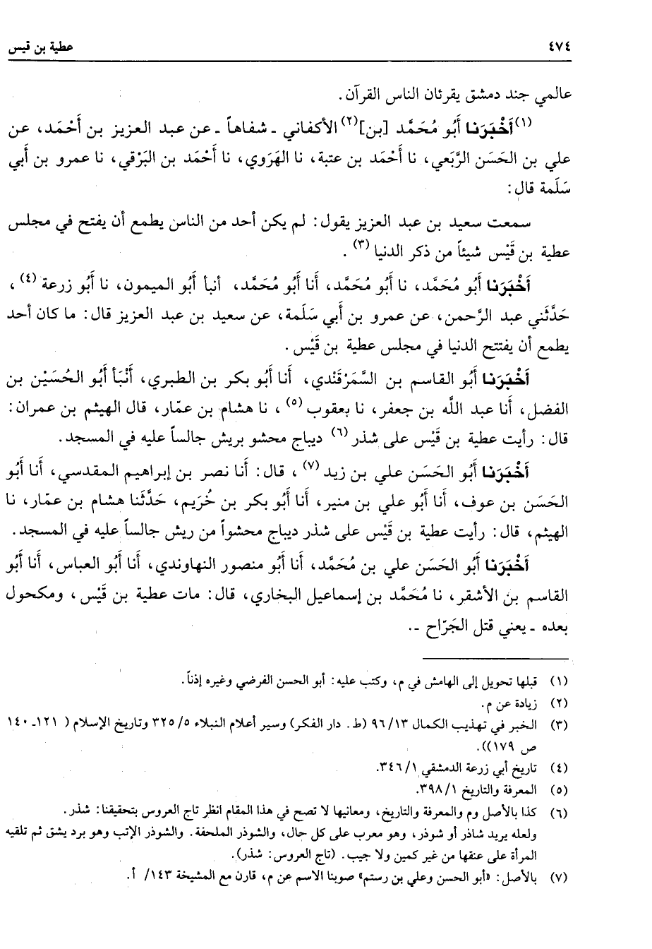 عالمي جند دمشق يقرئان الناس القرآن (1) أخبرنا أبو محمد بن (2) الأكفاني شفاها عن عبد العزيز بن أحمد عن علي بن الحسن الربعي نا أحمد بن عتبة نا الهروي نا أحمد بن البرقي نا عمرو بن أبي سلمة قال سمعت سعيد بن عبد العزيز يقول لم يكن أحد من الناس يطمع أن يفتح في مجلس عطية بن قيس شيئا من ذكر الدنيا (3) أخبرنا أبو محمد نا أبو محمد أنا أبو محمد أنبأ أبو الميمون نا أبو زرعة (4) حدثني عبد الرحمن عن عمرو بن أبي سلمة عن سعيد بن عبد العزيز قال ما كا أحد يطمع أن يفتتح الدنيا في مجلس عطية بن قيس أخبرنا أبو القاسم بن السمرقندي أنا أبو بكر بن الطبري أنبأ أبو الحسين بن الفضل أنا عبد الله بن جعفر نا يعقوب (5) نا هشام بن عمار قال الهيثم بن عمران قال رأيت عطية بن قيس على شذر (6) ديباج محشو بريش جالسا عليه في المسجد أخبرنا أبو الحسن علي بن زيد (7) قال أنا نصر بن إبراهيم المقدسي أنا أبو الحسن بن عوف أنا أبو علي بن منير أنا أبو بكر بن خريم حدثنا هشام بن عمار نا الهيثم قال رأيت عطية بن قيس على شذر ديباج محشوا من ريش جالسا عليه في المسجد أخبرنا أبو الحسن علي بن محمد أنا أبو منصور النهاوندي أنا أبو العباس أنا أبو القاسم بن الأشقر نا محمد بن إسماعيل البخاري قال مات عطية بن قيس ومكحول بعده يعني قتل الجراح