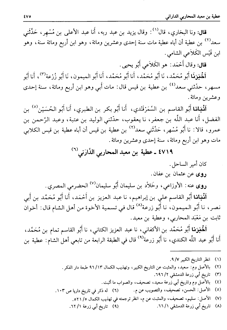 4719 - عطية بن معبد المحاربي الدارني (6) كان أمير الساحل روى عن عثمان بن عفان روى عنه الأوزاعي وخلاد بن سليمان (7) أبو سليمان الحضرمي المصري أنبأنا أبو القاسم علي بن إبراهيم نا عبد العزيز بن أحمد أنا أبو محمد بن أبي نصر نا أبو الميمون نا أبو زرعة (8) قال في تسمية الأخوة من أهل الشام قال أخوان ثابت بن معبد المحاربي وعطية بن معبد أخبرنا أبو محمد بن الأكفاني نا عبد العزيز الكتاني نا أبو القاسم تمام بن محمد أنا أبو عبد الله الكندي نا أبو زرعة (9) قال في الطبقة الرابعة من تابعي أهل الشام عطية بن
