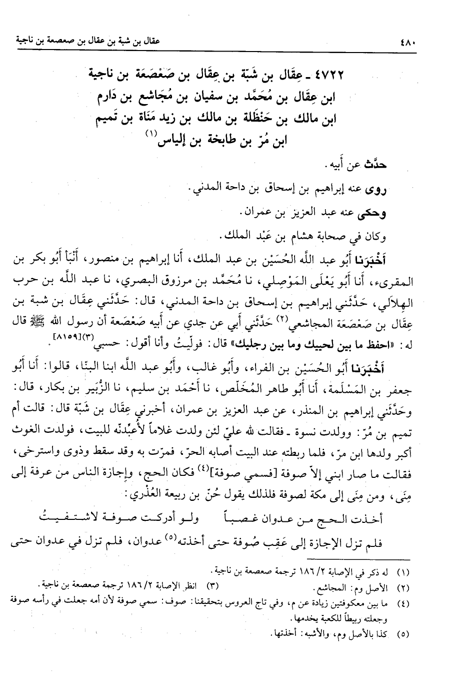 4722 - عقال بن شبة بن عقال بن صعصعة بن ناجية بن عقال بن محمد بن سفيان بن مجاشع بن دارم ابن مالك بن حنظلة بن مالك بن زيد مناة بن تميم بن مر بن طابخة بن إلياس (1) حدث عن أبيه روى عنه إبراهيم بن إسحاق بن داحة المدني وحكى عنه عبد العزيز بن عمران وكان في صحابة هشام بن عبد الملك أخبرنا أبو عبد الله الحسين بن عبد الملك أنا إبراهيم بن منصور أنبأ أبو بكر بن المقرئ أنا أبو يعلى الموصلي نا محمد بن مرزوق البصري نا عبد الله بن حرب الهلالي حدثني إبراهيم بن إسحاق بن داحة المدني قال حدثني عقال بن شبة بن عقال بن صعصعة المجاشعي (2) حدثني أبي عن جدي عن أبيه صعصعة أن رسول الله (صلى الله عليه وسلم) قال له احفظ ما بين لحييك وما بين رجليك قال فوليت وأنا أقول حسبي (3)