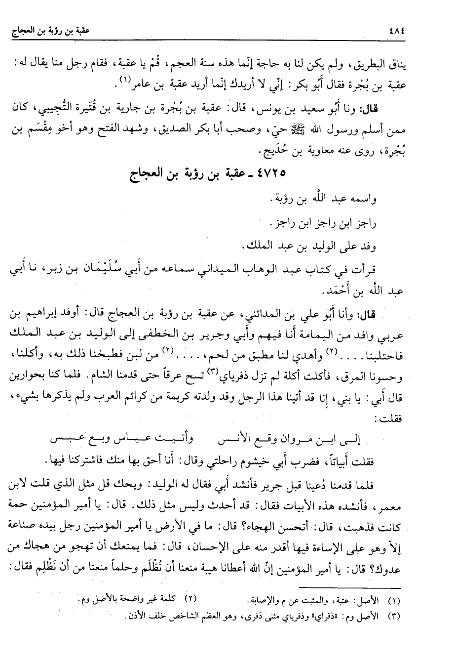 4725 - عقبة بن رؤبة بن العجاج واسمه عبد الله بن رؤبة راجز ابن راجز ابن راجز وفد على الوليد بن عبد الملك قرأت في كتاب عبد الوهاب الميداني سماعه من أبي سليمان بن زبر نا أبي عبد الله بن أحمد قال وأنا أبو علي بن المدائني عن عقبة بن رؤبة بن العجاج قال أوفد إبراهيم بن عربي وافد من اليمامة أنا فيهم وأبي وجرير بن الخطفي إلى الوليد بن عبد الملك فاحتلبنا (2) وأهدي (2) لنا مطبق من لحم (2) من لبن فطبخنا ذلك به وأكلنا وحسونا المرق فأكلت أكلة لم تزل ذفرياي (3) تسح عرقا حتى قدمنا الشام فلما كنا بحوارين قال أبي يا بني إنا قد أتينا هذا الرجل وقد ولدته كريمة من كرائم العرب ولم يذكرها بشئ فقلت * إلى ابن مروان وقع الأنس * وأتيت عباس وبع عبس * فقلت أبياتا فضرب أبي خيشوم راحلتي وقال أنا أحق بها منك فاشتركنا فيها فلما قدمنا دعينا قبل جرير فأنشد أبي فقال له الوليد ويحك قل مثل الذي قلت لابن معمر فأنشده هذه الأبيات فقال قد أحدث وليس مثل ذلك قال يا أمير المؤمنين حمة كانت فذهبت قال أتحسن الهجاء قال ما في الأرض يا أمير المؤمنين رجل بيده صناعة إلا وهو على الإساءة فيها أقدر منه على الإحسان قال فما يمنعك أن تهجو من هجاك من عدوك قال يا أمير المؤمنين إن الله أعطانا هيبة منعنا أن نظلم وحلما منعنا من أن نظلم فقال