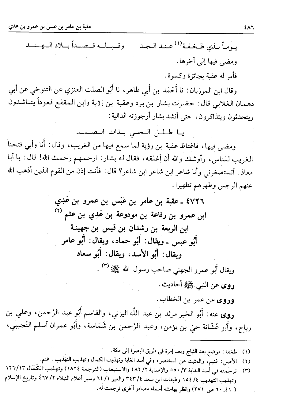 4726 - عقبة بن عامر بن عبس بن عمرو بن عدي بن عمرو بن رفاعة بن مودوعة بن عدي بن عثم (1) بن الربعة بن رشدان بن قيس بن جهينة أبو عبس ويقال أبو حماد ويقال أبو عامر ويقال أبو الأسد ويقال أبو سعاد ويقال أبو عمرو الجهني صاحب رسول الله (صلى الله عليه وسلم) (3) روى عن النبي (صلى الله عليه وسلم) أحاديث وروي عن عمر بن الخطاب روى عنه أبو الخير مرثد بن عبد الله اليزني والقاسم أبو عبد الرحمن وعلي بن رباح وأبو عشانة حي بن يؤمن وعبد الرحمن بن شماسة وأبو عمران أسلم التجيبي