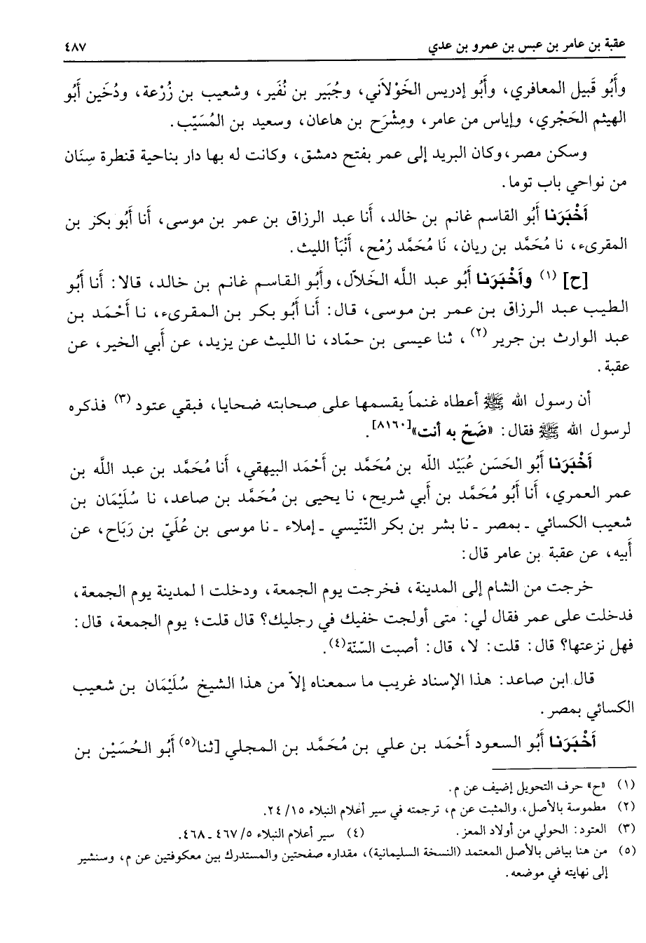 [8160] أخبرنا أبو الحسن عبيد الله بن محمد بن أحمد البيهقي أنا محمد بن عبد الله بن عمر العمري أنا أبو محمد بن أبي شريح نا يحيى بن محمد بن صاعد نا سليمان بن شعيب الكسائي بمصر نا بشر بن بكر التنيسي إملاء نا موسى بن علي بن رباح عن أبيه عن عقبة بن عامر قال خرجت من الشام إلى المدينة فخرجت يوم الجمعة ودخلت المدينة يوم الجمعة فدخلت على عمر فقال لي متى أولجت خفيك في رجليك قال قلت يوم الجمعة قال فهل نزعتها قال قلت لا قال أصبت السنة (4) قال ابن صاعد هذا الإسناد غريب ما سمعناه إلا من هذا الشيخ سليمان بن شعيب الكسائي بمصر أخبرنا أبو السعود أحمد بن علي بن محمد بن المجلي ثنا (6) أبو الحسين بن