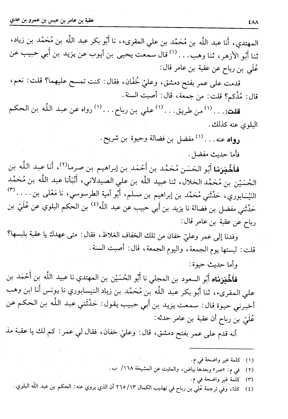المهتدي أنا عبد الله بن محمد بن علي المقرئ نا أبو بكر عبد الله بن محمد بن زياد ثنا أبو الأزهر ثنا وهب (1) قال سمعت يحيى بن أيوب عن يزيد بن أبي حبيب عن علي بن رباح عن عقبة بن عامر قال قدمت على عمر بفتح دمشق وعلي خفان فقال كنت تمسح عليهما قلت نعم قال مذكم قلت من جمعة قال أصبت السنة قلت (1) من طريق (1) علي بن رباح (1) رواه عن عبد الله بن الحكم البلوي عنه كذلك رواه عنه (1) مفضل بن فضالة وحيوة بن شريح فأما حديث مفضل فأخبرنا أبو الحسن محمد بن أحمد بن إبراهيم بن صرما (2) أنا عبد الله بن الحسين بن محمد الخلال ثنا عبيد الله بن علي الصيدلاني أنبأنا عبد الله بن محمد النيسابوري حدثني محمد بن إبراهيم بن مسلم أبو أمية الطرسوسي نا معلى بن (3) حدثني مفضل بن فضالة نا يزيد بن أبي حبيب عن عبد الله بن (4) الحكم البلوي عن علي بن رباح عن عقبة بن عامر قال وفدنا إلى عمر وعلي خفان من تلك الخفاف الغلاظ فقال متى عهدك يا عقبة بلبسها قلت لبستها يوم الجمعة واليوم الجمعة قال أصبت السنة وأما حديث حيوة فأخبرناه أبو السعود بن المجلي نا أبو الحسين بن المهتدي نا عبيد الله بن أحمد بن علي المقرئ ثنا أبو بكر عبد الله بن محمد بن زياد النيسابوري نا يونس أنا ابن وهب أخبرني حيوة قال سمعت يزيد بن أبي حبيب يقول حدثني عبد الله بن الحكم عن علي بن رباح أن عقبة بن عامر حدثه أنه قدم على عمر بفتح دمشق قال وعلي خفان فقال لي عمر كم لك يا عقبة مذ