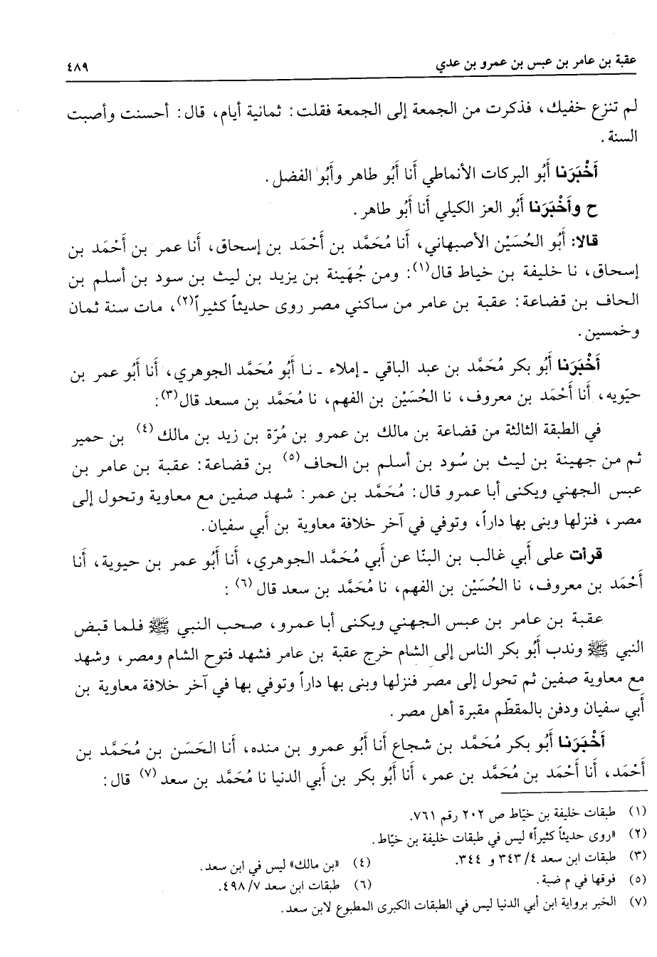لم تنزع خفيك فذكرت من الجمعة إلى الجمعة فقلت ثمانية أيام قال أحسنت وأصبت السنة أخبرنا أبو البركات الأنماطي أنا أبو طاهر وأبو الفضل ح وأخبرنا أبو العز الكيلي أنا أبو طاهر قالا أنا أبو الحسين الأصبهاني أنا محمد بن أحمد بن إسحاق أنا عمر بن أحمد بن إسحاق نا خليفة بن خياط قال (1) ومن جهينة بن يزيد بن ليث بن سود بن أسلم بن الحاف بن قضاعه عقبة بن عامر من ساكني مصر روى حديثا كثيرا (2) مات سنة ثمان وخمسين أخبرنا أبو بكر محمد بن عبد الباقي إملاء نا أبو محمد الجوهري أنا أبو عمر بن حيوية أنا أحمد بن معروف نا الحسين بن الفهم نا محمد بن مسعد قال (3) في الطبقة الثالثة من قضاعة بن مالك بن عمرو بن مرة بن زيد بن مالك (4) بن حمير ثم من جهينة بن ليث بن سود بن أسلم بن الحاف (5) بن قضاعة عقبة بن عامر بن عبس الجهني ويكنى أبا عمرو قال محمد بن عمر شهد صفين مع معاوية وتحول إلى مصر فنزلها وبنى بها دارا وتوفي في آخر خلافة معاوية بن أبي سفيان قرأت على أبي غالب بن البنا عن أبي محمد الجوهري أنا أبو عمر بن حيوية أنا أحمد بن معروف نا الحسين بن الفهم نا محمد بن سعد قال (6) عقبة بن عامر بن عبس الجهني ويكنى أبا عمر صحب النبي (صلى الله عليه وسلم) فلما قبض النبي (صلى الله عليه وسلم وندب أبو بكر الناس إلى الشام خرج عقبة بن عامر فشهد فتوح الشام ومصر وشهد مع معاوية صفين ثم تحول إلى مصر فنزلها وبنى بها دارا وتوفي بها في آخر خلافة معاوية بن أبي سفيان ودفن بالمقطم مقبرة أهل مصر أخبرنا أبو بكر محمد بن شجاع أنا أبو عمرو بن منده أنا الحسن بن محمد بن أحمد أنا أحمد بن محمد بن عمر أنا أبو بكر بن أبي الدنيا نا محمد بن سعد (7) قال