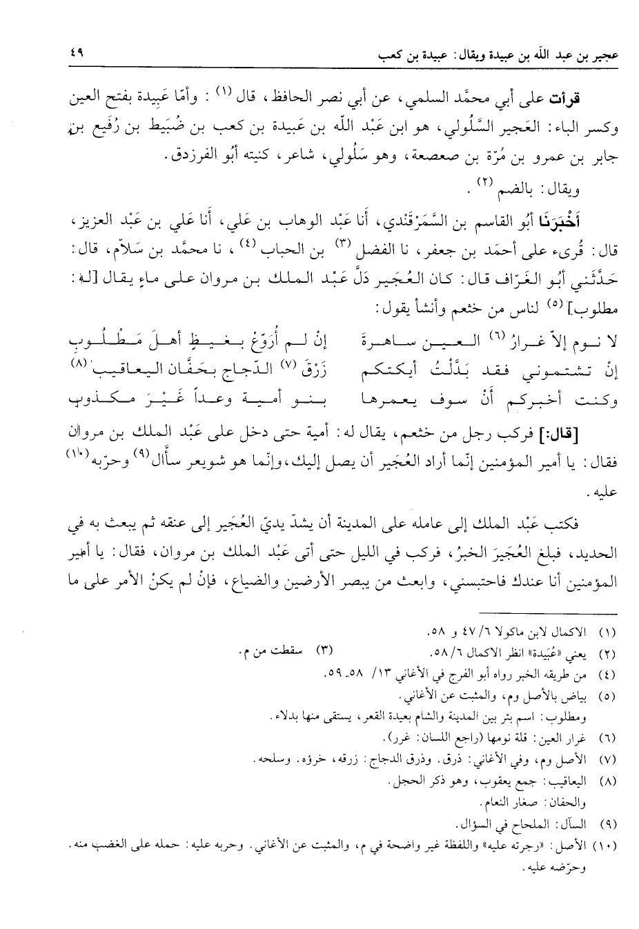 قرأت على أبي محمد السلمي عن أبي نصر الحافظ قال (1) وأما عبيدة بفتح العين وكسر الباء العجير السلولي هو ابن عبد الله بن عبيدة بن كعب بن ضبيط بن رفيع بن جابر بن عمرو بن مرة بن صعصعة وهو سلولي شاعر كنيته أبو الفرزدق ويقال بالضم (2) أخبرنا أبو القاسم بن السمرقندي أنا عبد الوهاب بن علي أنا علي بن عبد العزيز قال قرئ على أحمد بن جعفر نا الفضل (3) بن الحباب (4) نا محمد بن سلام قال حدثني أبو الغراف قال كان العجير دل عبد الملك بن مروان على ماء يقال له مطلوب (5) لناس من خثعم وأنشأ يقول * لا نوم إلا غرار (6) العين ساهرة * إن لم أروع بغيظ أهل مطلوب إن تشتموني فقد بدلت أيكتكم * زرق (7) الدجاج بحفان اليعاقيب (8) وكنت أخبركم أن سوف يعمرها * بنو أمية وعدا غير مكذوب * قال فركب رجل من خثعم يقال له أمية حتى دخل على عبد الملك بن مروان فقال يا أمير المؤمنين إنما أراد العجير أن يصل إليك وإنما هو شويعر سأل (9) وحربه (10) عليه فكتب عبد الملك إلى عامله على المدينة أن يشد يدي العجير إلى عنقه ثم يبعث به في الحديد فبلغ العجير الخبر فركب في الليل حتى أتى عبد الملك بن مروان فقال يا أمير المؤمنين أنا عندك فاحتبسني وابعث من يبصر الأرضين والضياع فإن لم يكن الأمر على ما