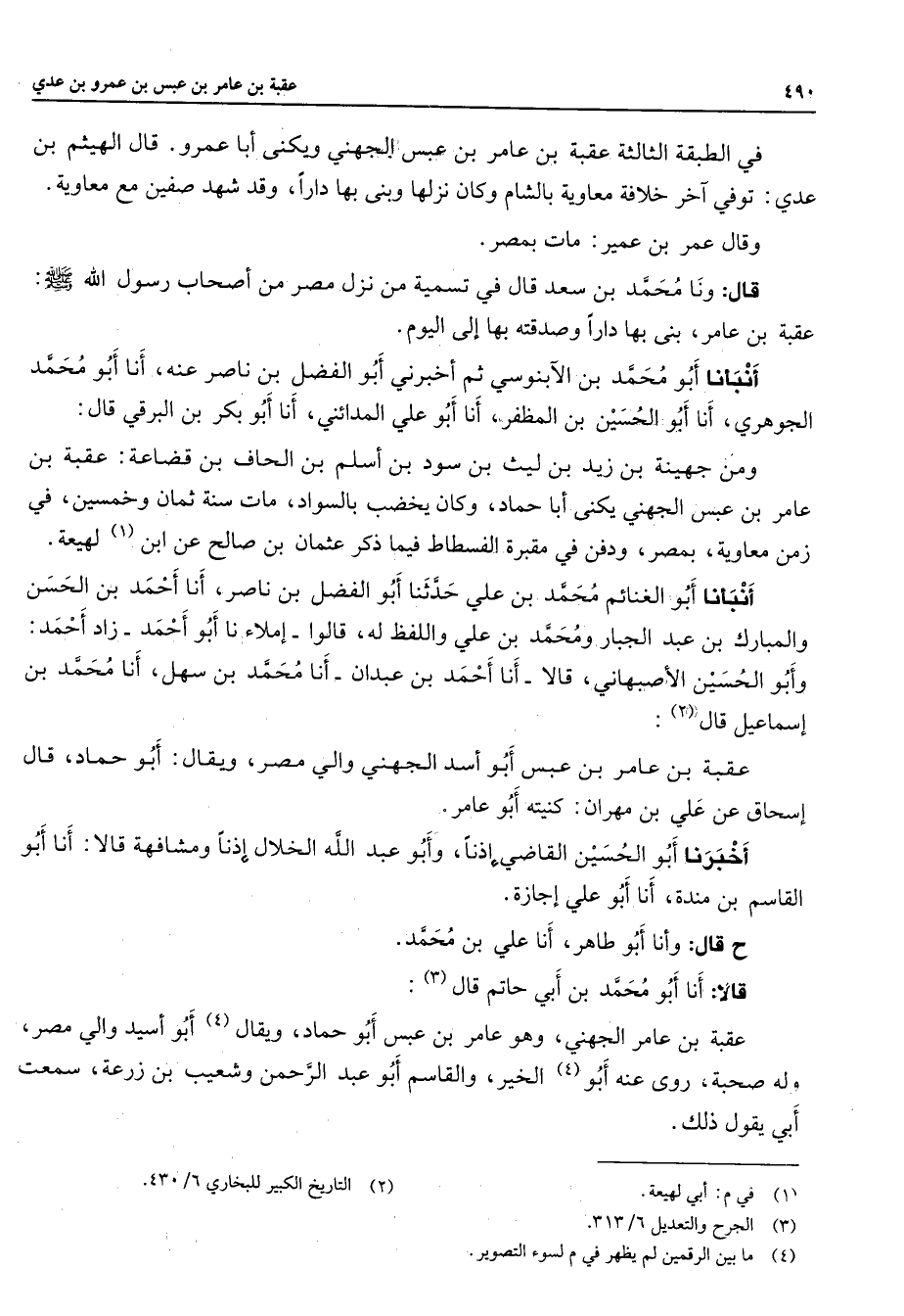 في الطبقة الثالثة عقبة بن عامر بن عبس الجهني ويكنى أبا عمرو قال الهيثم بن عدي توفي آخر خلافة معاوية بالشام وكان نزلها وبنى بها دارا وقد شهد صفين مع معاوية وقال عمر بن عمير مات بمصر قال ونا محمد بن سعد قال في تسمية من نزل مصر من أصحاب رسول الله (صلى الله عليه وسلم) عقبة بن عامر بنى بها دارا وصدقته بها إلى اليوم أنبأنا أبو محمد بن الأبنوسي ثم أخبرني أبو الفضل بن ناصر عنه أنا أبو محمد الجوهري أنا أبو الحسين بن المظفر أنا أبو علي المدائني أنا أبو بكر البرقي قال ومن جهينة بن زيد بن ليث بن سود بن أسلم بن الحاف بن قضاعة عقبة بن عامر بن عبس الجهني يكنى أبا حماد وكان يخضب بالسواد مات سنة ثمان وخمسين في زمن معاوية بمصر ودفن في مقبرة الفسطاط فيما ذكر عثمان بن صالح عن ابن (1) لهيعة أنبأنا أبو الغنائم محمد بن علي حدثنا أبو الفضل بن ناصر أنا أحمد بن الحسن والمبارك بن عبد الجبار ومحمد بن علي واللفظ له قالوا إملاء نا أبو أحمد زاد أحمد وأبو الحسين الأصبهاني قالا أنا أحمد بن عبدان أنا محمد بن سهل أنا محمد بن إسماعيل قال (2) عقبة بن عامر بن عبس أبو أسد الجهني والي مصر ويقال أبو حماد قال إسحاق عن علي بن مهران كنيته أبو عامر أخبرنا أبو الحسين القاضي إذنا وأبو عبد الله الخلال إذنا ومشافهة قالا أنا أبو القاسم بن مندة أنا أبو علي إجازة ح قال وأنا أبو طاهر أنا علي بن محمد قالا أنا أبو محمد بن أبي حاتم قال (3) عقبة بن عامر الجهني وهو عامر بن عبس أبو حماد ويقال (4) أبو أسيد والي مصر وله صحبة روى عنه (4) أبو الخير والقاسم أبو عبد الرحمن وشعيب بن زرعة سمعت