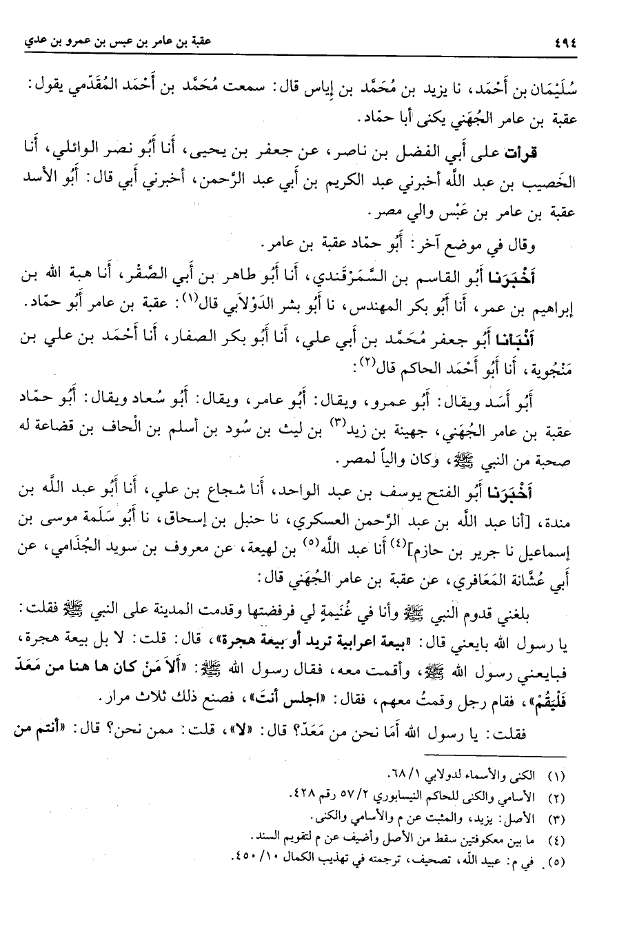 سليمان بن أحمدنا يزيد بن محمد بن إياس قال سمعت محمد بن أحمد المقدمي يقول عقبة بن عامر الجهني يكنى أبا حماد قرأت على أبي الفضل بن ناصر عن جعفر بن يحيى أنا أبو نصر الوائلي أنا الخصيب بن عبد الله أخبرني عبد الكريم بن أبي عبد الرحمن أخبرني أبي قال أبو الأسد عقبة بن عامر بن عبس والي مصر وقال في موضع آخر أبو حماد عقبة بن عامر أخبرنا أبو القاسم بن السمرقندي أنا أبو طاهر بن أبي الصقر أنا هبة الله بن إبراهيم بن عمر أنا أبو بكر المهندس نا أبو بشر الدولابي قال (1) عقبة بن عامر أبو حماد أنبأنا أبو جعفر محمد بن أبي علي أنا أبو بكر الصفار أنا أحمد بن علي بن منجوية أنا أبو أحمد الحاكم قال (2) أبو أسد ويقال أبو عمرو ويقال أبو عامر ويقال أبو سعاد ويقال أبو حماد عقبة بن عامر الجهني جهينة بن زيد (3) بن ليث بن سود بن أسلم بن الحاف بن قضاعة له صحبة من النبي (صلى الله عليه وسلم) وكان واليا لمصر أخبرنا أبو الفتح يوسف بن عبد الواحد أنا شجاع بن علي أنا أبو عبد الله بن مندة أنا عبد الله بن عبد الرحمن العسكري نا حنبل بن إسحاق نا أبو سلمة موسى بن إسماعيل نا جرير بن حازم (4) أنا عبد الله (5) بن لهيعة عن معروف بن سويد الجذامي عن أبي عشانة المعافري عن عقبة بن عامر الجهني قال بلغني قدوم النبي (صلى الله عليه وسلم) وأنا في غنيمة لي فرفضتها وقدمت المدينة على النبي (صلى الله عليه وسلم) فقلت يا رسول الله بايعني قال بيعة أعرابية تريد أو بيعة هجرة قال قلت لا بل بيعة هجرة فبايعني رسول الله (صلى الله عليه وسلم) وأقمت معه فقال رسول الله (صلى الله عليه وسلم) ألا من كان ها هنا من معد فليقم فقام رجل وقمت معهم فقال أجلس أنت فصنع ذلك ثلاث مرار فقلت يا رسول الله أما نحن من معد قال لا قلت ممن نحن قال أنتم من