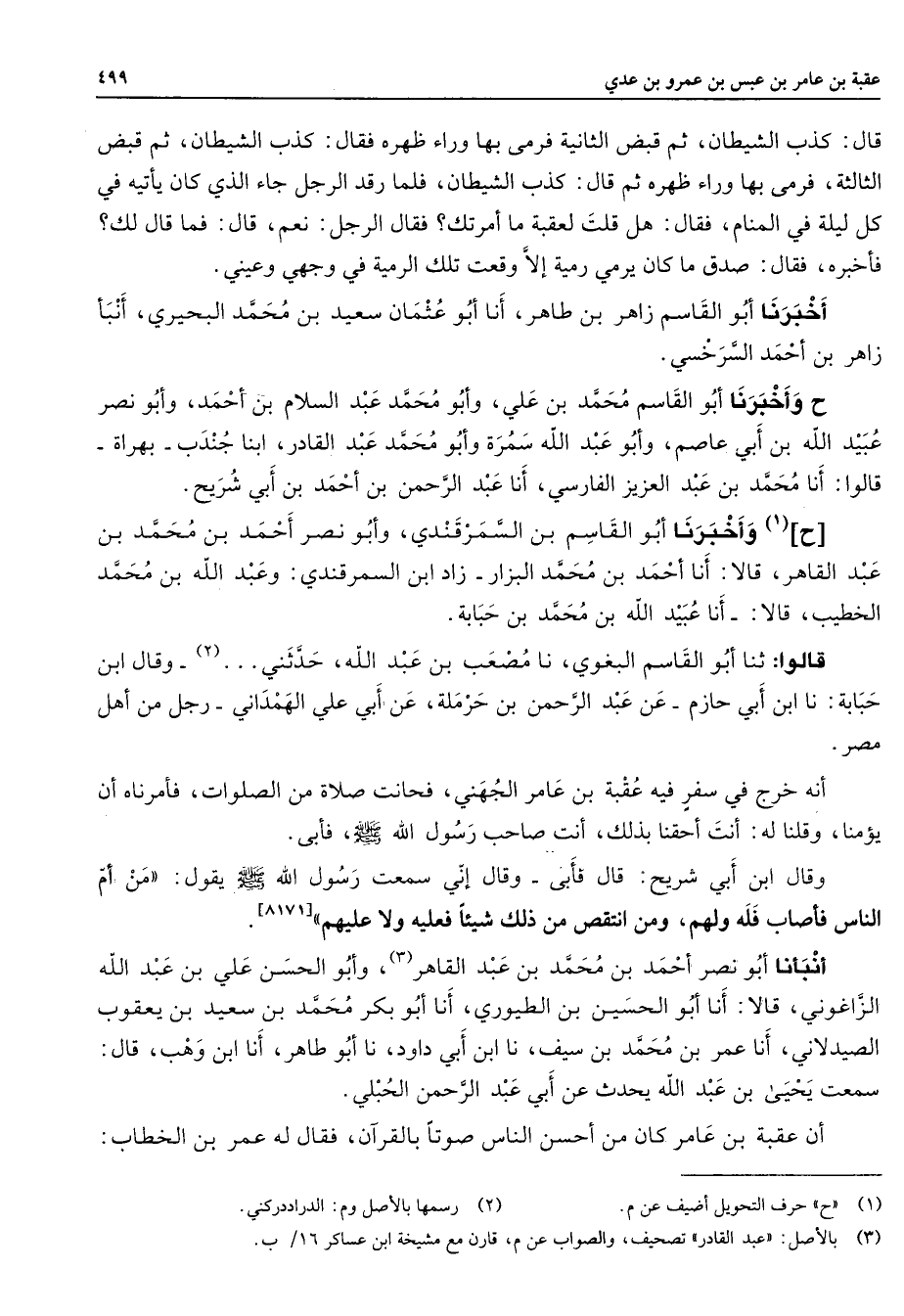 قال كذب الشيطان ثم قبض الثانية فرمى بها وراء ظهره فقال كذب الشيطان ثم قبض الثالثة فرمى بها وراء ظهره ثم قال كذب الشيطان فلما رقد الرجل جاء الذي كان يأتيه في كل ليلة في المنام فقال هل قلت لعقبة ما أمرتك فقال الرجل نعم قال فما قال لك فأخبره فقال صدق ما كان يرمي رمية إلا وقعت تلك الرمية في وجهي وعيني أخبرنا أبو القاسم زاهر بن طاهر أنا أبو عثمان سعيد بن محمد البحيري أنبأ زاهر بن أحمد السرخسي ح وأخبرنا أبو القاسم محمد بن علي وأبو محمد عبد السلام بن أحمد وأبو نصر عبيد الله بن أبي عاصم وأبو عبد الله سمرة وأبو محمد عبد القادر ابنا جندب بهراة قالوا أنا محمد بن عبد العزيز الفارسي أنا عبد الرحمن بن أحمد بن أبي شريح ح (1) وأخبرنا أبو القاسم بن السمرقندي وأبو نصر أحمد بن محمد بن عبد القاهر قالا أنا أحمد بن محمد البزار زاد ابن السمرقندي وعبد الله بن محمد الخطيب قالا أنا عبيد الله بن محمد بن حبابة قالوا ثنا أبو القاسم البغوي نا مصعب بن عبد الله حدثني