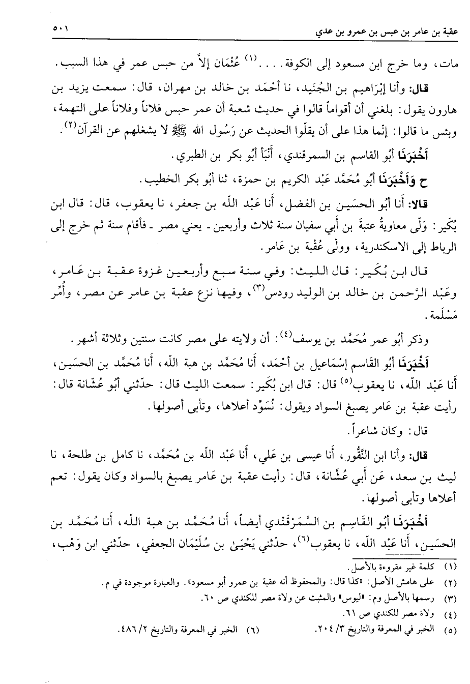 (1) عثمان إلا من حبس عمر في هذا السبب قال وأنا إبراهيم بن الجنيد نا أحمد بن خالد بن مهران قال سمعت يزيد بن هارون يقول بلغني أن أقواما قالوا في حديث شعبة أن عمر حبس فلانا وفلانا على التهمة وبئس ما قالوا إنما هذا على أن يقلوا الحديث عن رسول الله (صلى الله عليه وسلم) لا يشغلهم عن القرآن (2) أخبرنا أبو القاسم بن السمرقندي أنبأ أبو بكر بن الطبري ح وأخبرنا أبو أبو محمد عبد الكريم بن حمزة ثنا أبو بكر الخطيب قالا أنا أبو الحسين بن الفضل نا عبد الله بن جعفر أنا يعقوب قال قال ابن بكير ولى معاوية عتبة بن أبي سفيان سنة ثلاث وأربعين يعني مصر فأقام سنة ثم خرج إلى الرباط إلى الإسكندرية وولى عقبة بن عامر قال ابن بكير قال الليث وفي سنة سبع وأربعين غزوة عقبة بن عامر وعبد الرحمن بن خالد بن الوليد رودس (3) وفيها نزع عقبة بن عامر عن مصر وأمر مسلمة وذكر أبو عمر محمد بن يوسف (4) أن ولايته على مصر كانت سنتين وثلاثة أشهر أخبرنا أبو القاسم إسماعيل بن أحمد أنا محمد بن هبة الله أنا محمد بن الحسين أنا عبد الله نا يعقوب (5) قال قال ابن بكير سمعت الليث قال حدثني أبو عشانة قال رأيت عقبة بن عامر يصبغ السواد ويقول نسود أعلاها وتأبى أصولها قال وكان شاعرا قال وأنا ابن النقور أنا عيسى بن علي أنا عبد الله بن محمد نا كامل بن طلحة نا ليث بن سعد عن أبي عشانة قال رأيت عقبة بن عامر يصبغ بالسواد وكان يقول تعم أعلاها وتأبى أصولها أخبرنا أبو القاسم بن السمرقندي أيضا أنا محمد بن هبة الله أنا محمد بن الحسين أنا عبد الله نا يعقوب حدثني يحيى بن سليمان الجعفي حدثني ابن وهب