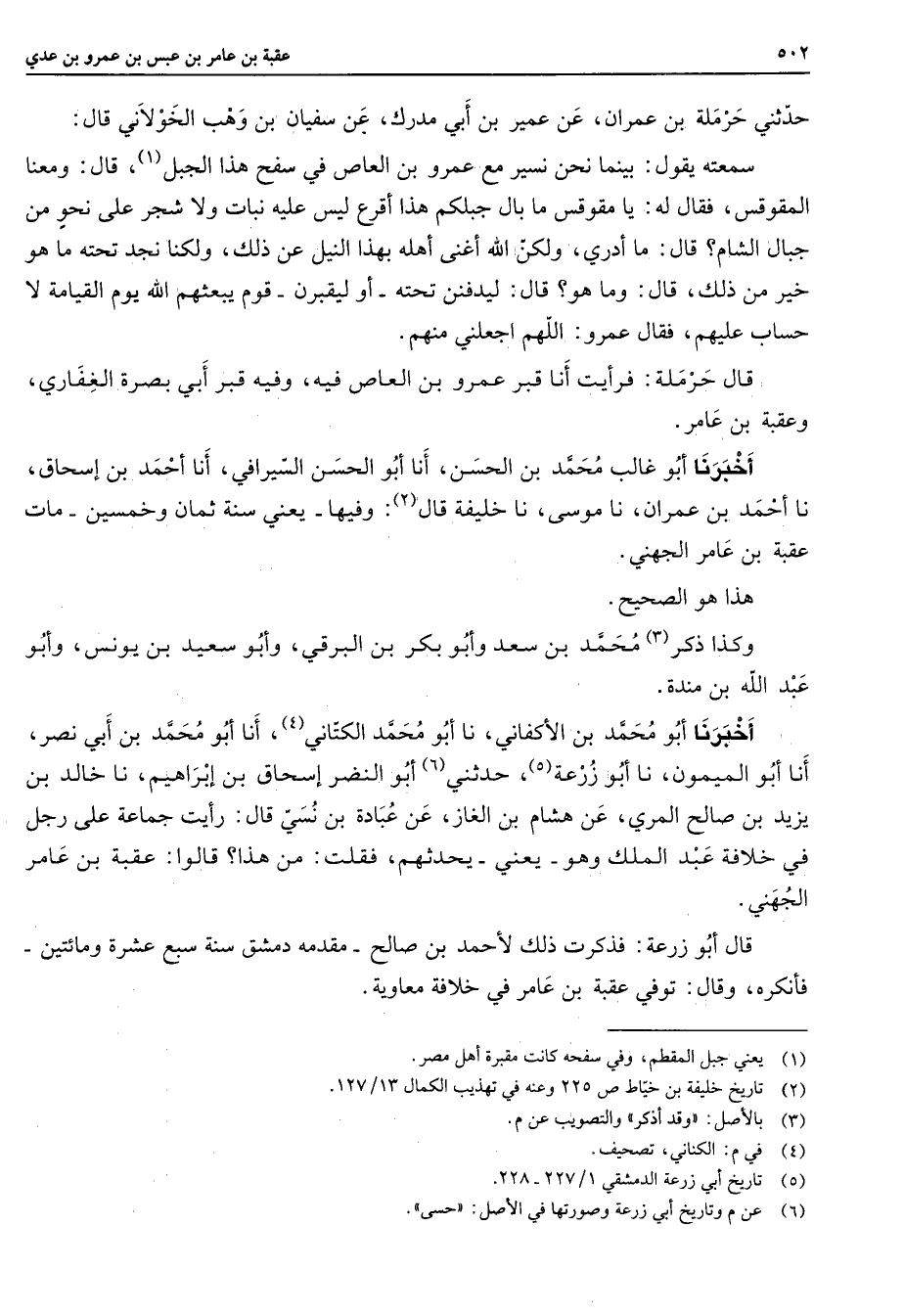 حدثني حرملة بن عمران عن عمير بن أبي مدرك عن سفيان بن وهب الخولاني قال سمعته يقول بينما نحن نسير مع عمرو بن العاص في سفح هذا الجبل (1) قال ومعنا المقوقس فقال له يا مقوقس ما بال جبلكم هذا أقرع ليس عليه نبات ولا شجر على نحو من جبال الشام قال ما أدري ولكن الله أغنى أهله بهذا النيل عن ذلك ولكنا نجد تحته ما هو خير من ذلك قال وما هو قال ليدفنن تحته أو ليقبرن قوم يبعثهم الله يوم القيامة لا حساب عليهم فقال عمرو اللهم اجعلني منهم قال حرملة فرأيت أنا قبر عمرو بن العاص فيه وفيه قبر أبي بصرة الغفاري وعقبة بن عامر أخبرنا أبو غالب محمد بن الحسن أنا أبو الحسن السيرافي أنا أحمد بن إسحاق نا أحمد بن عمران نا موسى نا خليفة قال (2) وفيها يعني سنة ثمان وخمسين مات عقبة بن عامر الجهني هذا هو الصحيح وكذا ذكر (3) محمد بن سعد وأبو بكر بن البرقي وأبو سعيد بن يونس وأبو عبد الله بن مندة أخبرنا أبو محمد بن الأكفاني نا أبو محمد الكتاني (4) أنا أبو محمد بن أبي نصر أنا أبو الميمون نا أبو زرعة (5) حدثني (6) أبو النضر إسحاق بن إبراهيم نا خالد بن يزيد بن صالح المري عن هشام بن الغاز عن عبادة بن نسي قال رأيت جماعة على رجل في خلافة عبد الملك وهو يعني يحدثهم فقلت من هذا قالوا عقبة بن عامر الجهني قال أبو زرعة فذكرت ذلك لأحمد بن صالح مقدمه دمشق سنة سبع عشرة ومائتين فأنكره وقال توفي عقبة بن عامر في خلافة معاوية