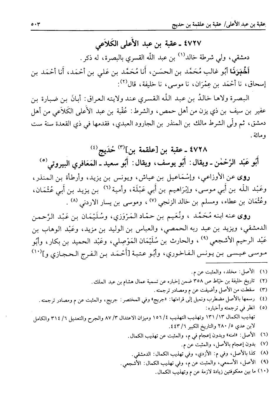 4727 - عقبة بن عبد الأعلى الكلاعي دمشق ولي شرطة خالد (1) بن عبد الله القسري بالبصرة له ذكر أخبرنا أبو غالب محمد بن الحسن أنا محمد بن علي بن أحمد أنا أحمد بن إسحاق نا أحمد بن عمران نا موسى نا خليفة قال (2) البصرة ولاها خالد بن عبد الله القسري عند ولايته العراق أبان بن ضبارة بن عفير بن سيف بن ذي يزن من أهل حمص والشرط عقبة بن عبد الأعلى الكلاعي من أهل دمشق ثم ولى الشرط مالك بن المنذر بن الجارود العبدي فقدمها في ذي القعدة سنة ست ومائة