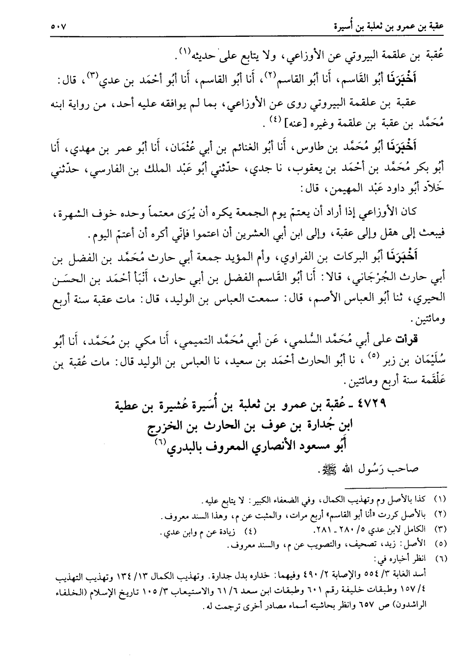 4729 - عقبة بن عمرو بن ثعلبة بن أسيرة عشيرة بن عطية بن جدارة بن عوف بن الحارث بن الخزرج أبو مسعود الأنصاري المعروف بالبدري (6) صاحب رسول الله (صلى الله عليه وسلم)