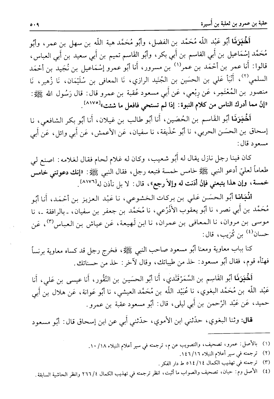 أخبرنا أبو عبد الله محمد بن الفضل وأبو محمد هبة الله بن سهل بن عمر وأبو محمد إسماعيل بن أبي القاسم بن ابي بكر وأبو القاسم تميم بن أبي سعيد بن أبي العباس قالوا أنا عمر (1) بن أحمد بن عمر بن مسرور أنا أبو عمرو إسماعيل بن نجيد بن أحمد السلمي (2) أنبأ علي بن الحسين بن الجنيد الرازي نا المعافى بن سليمان نا زهير نا منصور بن المعتمر عن ربعي عن أبي مسعود عقبة بن عمرو قال قال رسول الله (صلى الله عليه وسلم) إن مما أدرك الناس من كلام النبوة إذا لم تستحي فافعل ما شئت