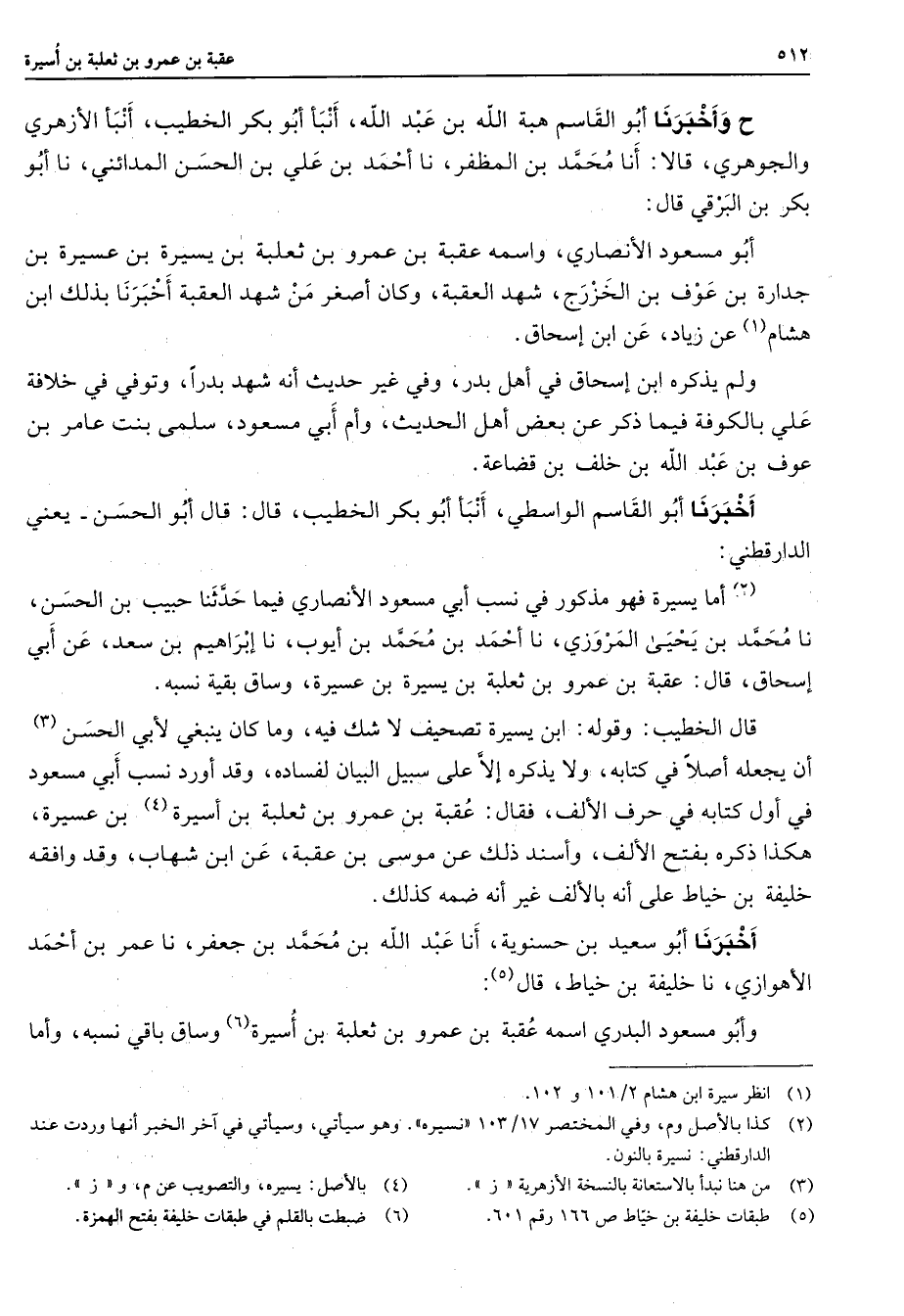 ح وأخبرنا أبو القاسم أنبأ أبو بكر الخطيب أنبأ الأزهري والجوهري قالا أنا محمد بن المظفر نا أحمد بن علي بن الحسن المدائني نا أبو بكر بن البرقي قال أبو مسعود الأنصاري واسمه عقبة بن عمرو بن ثعلبة بن يسيرة بن عسيرة بن جدارة بن عوف بن الخزرج شهد العقبة وكان أصغر من شهد العقبة أخبرنا بذلك ابن هشام (1) عن زياد عن ابن إسحاق ولم يذكره ابن إسحاق في أهل بدر وفي غير حديث أنه شهد بدرا وتوفي في خلافة علي بالكوفة فيما ذكر عن بعض أهل الحديث وأم أبي مسعود سلمى بنت عامر بن عوف بن عبد الله بن خلف بن قضاعة أخبرنا أبو القاسم الواسطي أنبأ أبو بكر الخطيب قال قال أبو الحسن يعني الدارقطني (2) أما يسيرة فهو مذكور في نسب أبي مسعود الأنصاري فيما حدثنا حبيب بن الحسن نا محمد بن يحيى المروزي نا أحمد بن محمد بن أيوب نا إبراهيم بن سعد عن أبي إسحاق قال عقبة بن عمرو بن ثعلبة بن يسيرة بن عسيرة وساق بقية نسبه قال الخطيب وقوله ابن يسيرة تصحيف لا شك فيه وما كان ينبغي لأبي الحسن (3) أن يجعله أصلا في كتابه ولا يذكره إلا على سبيل البيان لفساده وقد أورد نسب أبي مسعود في أول كتابه في حرف الألف فقال عقبة بن عمرو بن ثعلبة بن أسيرة (4) بن عسيرة هكذا ذكره بفتح الألف وأسند ذلك عن موسى بن عقبة عن ابن شهاب وقد وافقه خليفة بن خياط على أنه بالألف غير أنه ضمه كذلك أخبرنا أبو سعيد بن حسنوية أنا عبد الله بن محمد بن جعفر نا عمر بن أحمد الأهوازي نا خليفة بن خياط قال (5) وأبو مسعود البدري اسمه عقبة بن عمرو بن ثعلبة بن أسيرة (6) وساق باقي نسبه وأما