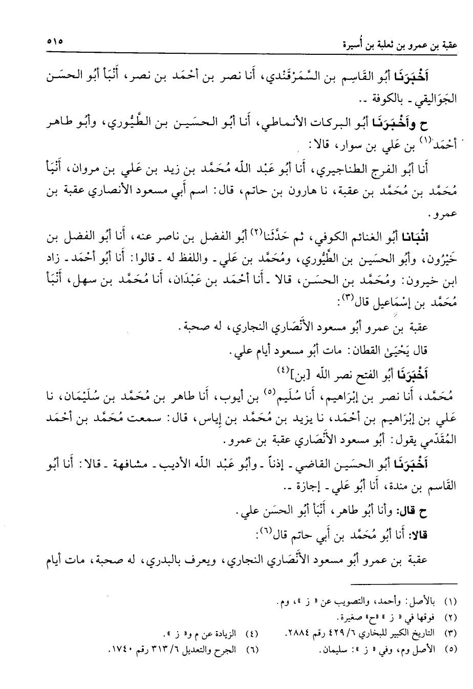 أخبرنا أبو القاسم بن السمرقندي أنا نصر بن أحمد بن نصر أنبأ أبو الحسن الجواليقي بالكوفة ح وأخبرنا أبو البركات الأنماطي أنا أبو الحسين بن الطيوري وأبو طاهر أحمد (1) بن علي بن سوار قالا أنا أبو الفرج الطناجيري أنا أبو عبد الله محمد بن زيد بن علي بن مروان أنبأ محمد بن محمد بن عقبة نا هارون بن حاتم قال اسم أبي مسعود الأنصاري عقبة بن عمرو أنبأنا أبو الغنائم الكوفي ثم حدثنا (2) أبو الفضل بن ناصر عنه أنا أبو الفضل بن خيرون وأبو الحسين بن الطيوري ومحمد بن علي واللفظ له قالوا أنا أبو أحمد زاد ابن خيرون ومحمد بن الحسن قالا أنا أحمد بن عبدان أنا محمد بن سهل أنبأ محمد بن إسماعيل قال (3) عقبة بن عمرو أبو مسعود الأنصاري النجاري له صحبة قال يحيى القطان مات أبو مسعود أيام علي أخبرنا أبو الفتح نصر الله بن (4) محمد أنا نصر بن إبراهيم أنا سليم (5) بن أيوب أنا طاهر بن محمد بن سليمان نا علي بن إبراهيم بن أحمد نا يزيد بن محمد بن إياس قال سمعت محمد بن أحمد المقدمي يقول أبو مسعود الأنصاري عقبة بن عمرو أخبرنا أبو الحسين القاضي إذنا وأبو عبد الله الأديب مشافهة قالا أنا أبو القاسم بن مندة أنا أبو علي إجازة ح قال وأنا أبو طاهر أنبأ أبو الحسن علي قالا أنا أبو محمد بن أبي حاتم قال (6) عقبة بن عمرو أبو مسعود الأنصاري النجاري ويعرف بالبدري له صحبة مات أيام