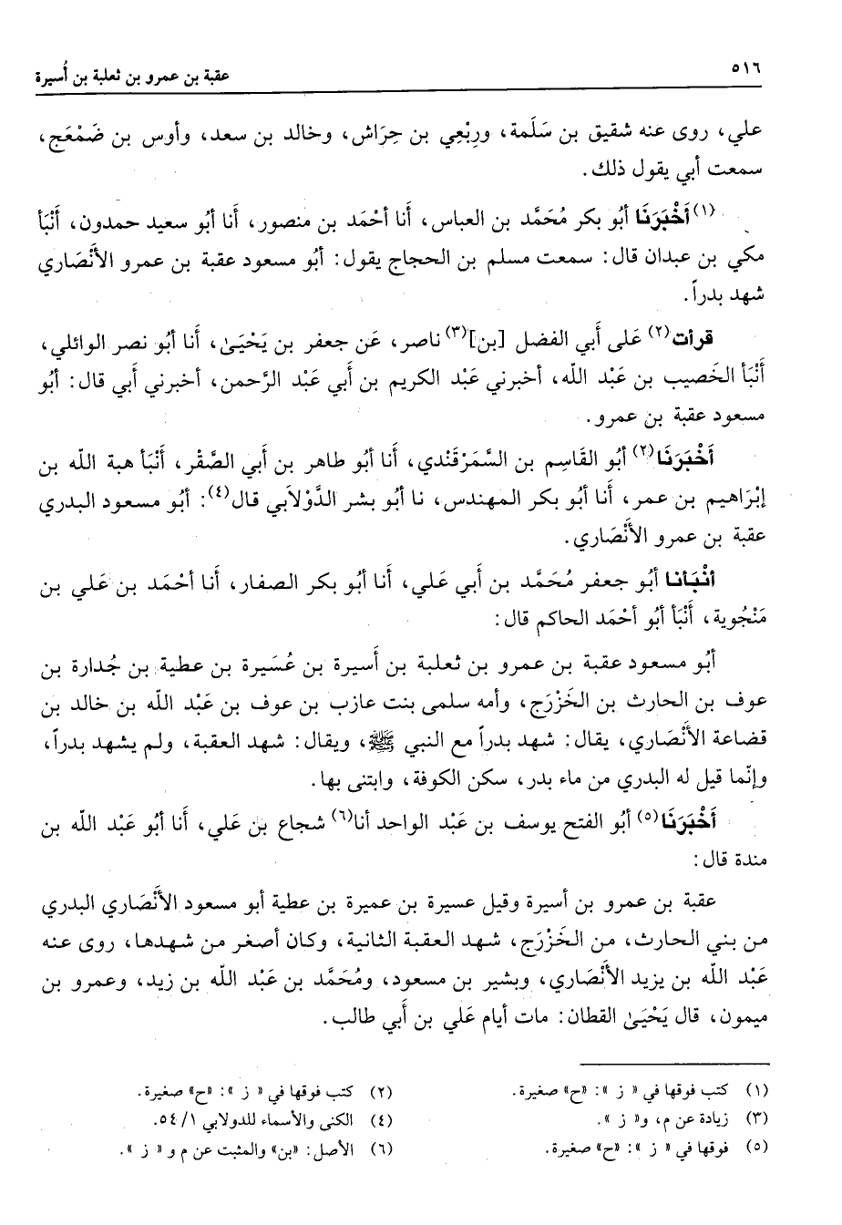 علي روى عنه شقيق بن سلمة وربعي بن حراش وخالد بن سعد وأوس بن ضمعج سمع ابي يقول ذلك (1) أخبرنا أبو بكر محمد بن العباس أنا أحمد بن منصور أنا أبو سعيد حمدون أنبأ مكي بن عبدان قال سمعت مسلم بن الحجاج يقول أبو مسعود عقبة بن عمرو الأنصاري شهد بدرا قرأت (2) على أبي الفضل بن (3) ناصر عن جعفر بن يحيى أنا أبو نصر الوائلي أنبأ الخصيب بن عبد الله أخبرني عبد الكريم بن أبي عبد الرحمن أخبرني أبي قال أبو مسعود عقبة بن عمرو أخبرنا (2) أبو القاسم بن السمرقندي أنا أبو طاهر بن أبي الصقر أنبأ هبة الله بن إبراهيم بن عمر أنا أبو بكر المهندس نا أبو بشر الدولابي قال (4) أبو مسعود البدري عقبة بن عمرو الأنصاري أنبأنا أبو جعفر محمد بن أبي علي أنا أبو بكر الصفار أنا أحمد بن علي بن منجوية أنبأ أبو احمد الحاكم قال أبو مسعود عقبة بن عمرو بن ثعلبة بن أسيرة بن عسيرة بن عطية بن جدارة بن عوف بن الحارث بن الخزرج وأمه سلمى بنت عازب بن عوف بن عبد الله بن خالد بن قضاعة الأنصاري يقال شهد بدرا مع النبي (صلى الله عليه وسلم) ويقال شهد العقبة ولم يشهد بدرا وإنما قيل له البدري من ماء بدر سكن الكوفة وابتنى بها أخبرنا (5) أبو الفتح يوسف بن عبد الواحد أنا (6) شجاع بن علي أنا أبو عبد الله بن مندة قال عقبة بن عمرو بن أسيرة وقيل عسيرة بن عميرة بن عطية أبو مسعود الأنصاري البدري من بني الحارث من الخزرج شهد العقبة الثانية وكان أصغر من شهدها روى عنه عبد الله بن يزيد الأنصاري وبشير بن مسعود ومحمد بن عبد الله بن زيد وعمرو بن ميمون قال يحيى القطان مات أيام علي بن أبي طالب