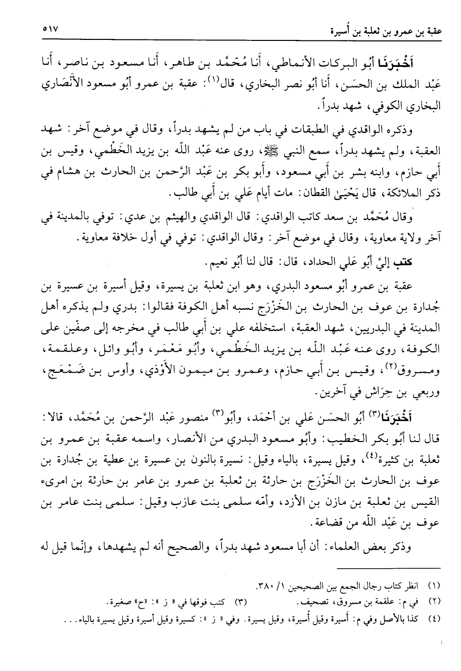 أخبرنا أبو البركات الأنماطي أنا محمد بن طاهر أنا مسعود بن ناصر أنا عبد الملك بن الحسن أنا أبو نصر البخاري قال (1) عقبة بن عمرو أبو مسعود الأنصاري البخاري الكوفي شهد بدرا وذكره الواقدي في الطبقات في باب من لم يشهد بدرا وقال في موضع آخر شهد العقبة ولم يشهد بدرا سمع النبي (صلى الله عليه وسلم) روى عنه عبد الله بن يزيد الخطمي وقيس بن أبي حازم وابنه بشر بن أبي مسعود وأبو بكر بن عبد الرحمن بن الحارث بن هشام في ذكر الملائكة قال يحيى القطان مات أيام علي بن أبي طالب وقال محمد بن سعد كاتب الواقدي قال الواقدي والهيثم بن عدي توفي بالمدينة في آخر ولاية معاوية وقال في موضع آخر وقال الواقدي توفى في أول خلافة معاوية كتب إلي أبو علي الحداد قال قال لنا أبو نعيم عقبة بن عمرو أبو مسعود البدري وهو ابن ثعلبة بن يسيرة وقيل أسيرة بن عسيرة بن جدارة بن عوف بن الحارث بن الخزرج نسبه أهل الكوفة فقالوا بدري ولم يذكره أهل المدينة في البدريين شهد العقبة استخلفه علي بن ابي طالب في مخرجه إلى صفين على الكوفة روى عنه عبد الله بن يزيد الخطمي وأبو معمر وأبو وائل وعلقمة ومسروق (2) وقيس بن أبي حازم وعمرو بن ميمون الأوذي وأوس بن ضمعج وربعي بن حراش في آخرين أخبرنا (3) أبو الحسن علي بن أحمد وأبو (3) منصور عبد الرحمن بن محمد قالا قال لنا أبو بكر الخطيب وأبو مسعود البدري من الأنصار واسمه عقبة بن عمرو بن ثعلبة بن كثيرة (4) وقيل يسيرة بالياء وقيل نسيرة بالنون بن عسيرة بن عطية بن جدارة بن عوف بن الحارث بن الخرزج بن حارثة بن ثعلبة بن عمرو بن عامر بن حارثة بن امرئ القيس بن ثعلبة بن مازن بن الأزد وأمه سلمى بنت عازب وقيل سلمى بنت عامر بن عوف بن عبد الله بن قضاعة وذكر بعض العلماء أن أبا مسعود شهد بدرا والصحيح أنه لم يشهدها وإنما قيل له