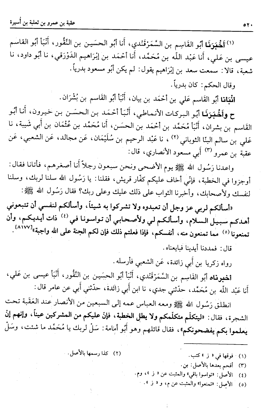 (1) أخبرنا أبو القاسم بن السمرقندي أنا أبو الحسين بن النقور أنبأ أبو القاسم عيسى بن علي أنا عبد الله بن محمد أنا أحمد بن إبراهيم الدورقي نا أبو داود نا شعبة قالا سمعت سعد بن إبراهيم يقول لم يكن أبو مسعود بدريا وقال الهكم كان يدريا أنبأنا أبو القاسم علي بن أحمد بن بيان أنبأ أبو القاسم بن بشران ح وأخبرنا أبو البركات الأنماطي أنبأ أحمد بن الحسن بن خيرون أنا أبو القاسم بن بشران أنبأ محمد بن أحمد بن الحسن أنا محمد بن عثمان بن أبي شيبة نا علي بن سالم البنا الثوباني (2) نا عبد الرحيم بن سليمان عن مجالد عن الشعبي عن عقبة بن عمرو (3) أبي مسعود الأنصاري قال واعدنا رسول الله (صلى الله عليه وسلم) يوم الأضحى ونحن سبعون رجلا أنا أصغرهم فأتانا فقال أوجزوا في الخطبة فإني أخاف عليكم كفار قريش فقلنا يا رسول الله سلنا لربك وسلنا لنفسك ولأصحابك وأخبرنا الثواب على ذلك عليك وعلى ربك فقال رسول الله (صلى الله عليه وسلم) أسألكم لربي عز وجل أن تعبدوه ولا تشركوا به شيئا أسألكم لنفسي أن تتبعوني أهدكم سبيل السلام وأسألكم لي ولأصحابي أن تواسونا في (4) ذات أيديكم وأن تمنعونا (5) مما تمنعون منه أنفسكم فإذا فعلتم ذلك فإن لكم الجنة على الله واجبة