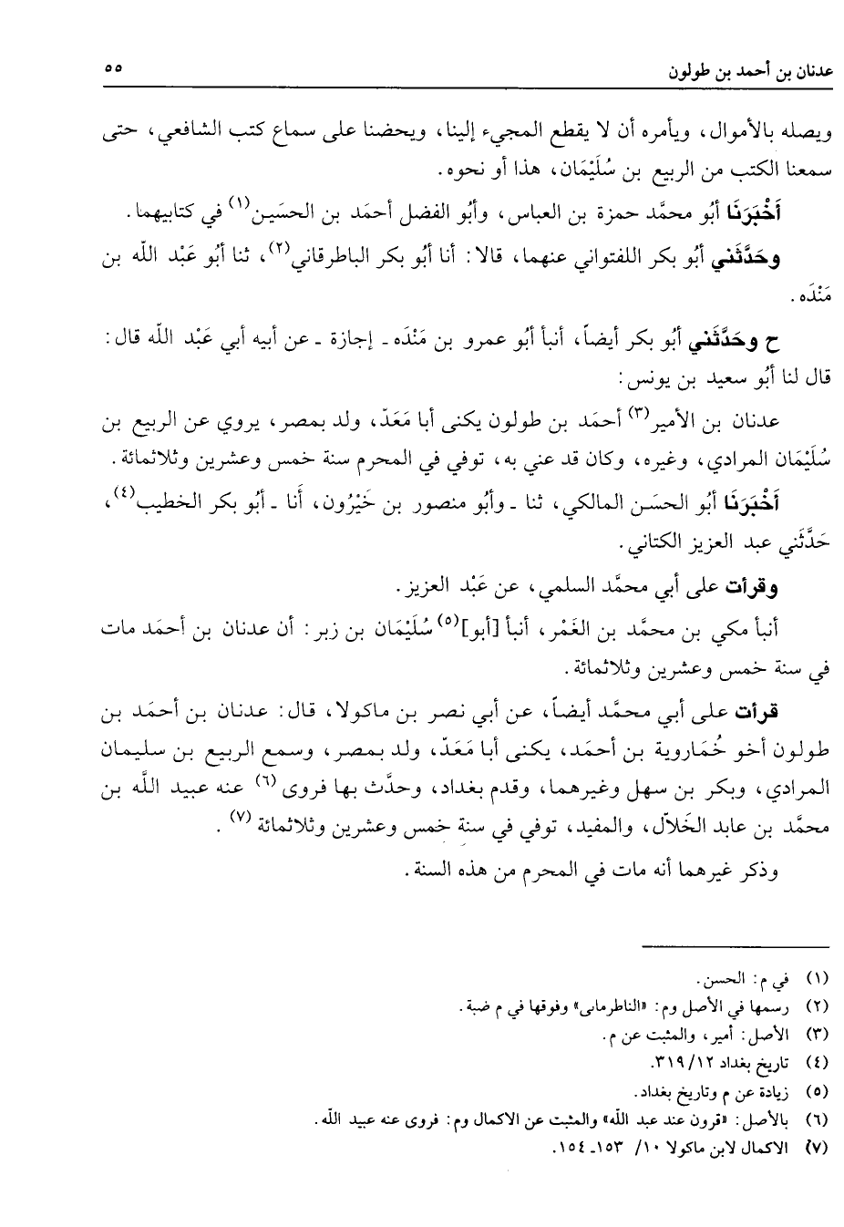 ويصله بالأموال ويأمره أن لا يقطع المجئ إلينا ويحضنا على سماع كتب الشافعي حتى سمعنا الكتب من الربيع بن سليمان هذا أو نحوه أخبرنا أبو محمد حمزة بن العباس وأبو الفضل أحمد بن الحسين (1) في كتابيهما وحدثني أبو بكر اللفتواني عنهما قالا أنا أبو بكر الباطرقاني (2) ثنا أبو عبد الله بن منده ح وحدثني أبو بكر أيضا أنبأ أبو عمرو بن منده إجازة عن أبيه أبي عبد الله قال قال لنا أبو سعيد بن يونس عدنان بن الأمير (3) أحمد بن طولون يكنى أبا معد ولد بمصر يروي عن الربيع بن سليمان المرادي وغيره وكان قد عني به توفي في المحرم سنة خمس وعشرين وثلاثمائة أخبرنا أبو الحسن المالكي ثنا وأبو منصور بن خيرون أنا أبو بكر الخطيب (4) حدثني عبد العزيز الكتاني وقرأت على أبي محمد السلمي عن عبد العزيز أنبأ مكي بن محمد بن الغمر أنبأ أبو (5) سليمان بن زبر أن عدنان بن أحمد مات في سنة خمس وعشرين وثلاثمائة قرأت على أبي محمد أيضا عن أبي نصر بن ماكولا قال عدنان بن أحمد بن طولون أخو خماروية بن أحمد بكنى أبا معد ولد بمصر وسمع الربيع بن سليمان المرادي وبكر بن سهل وغيرهما وقدم بغداد وحدث بها فروى (6) عنه عبيد الله بن محمد بن عابد الخلال والمفيد توفي في سنة خمس وعشرين وثلاثمائة (7) وذكر غيرهما أنه مات في المحرم من هذه السنة