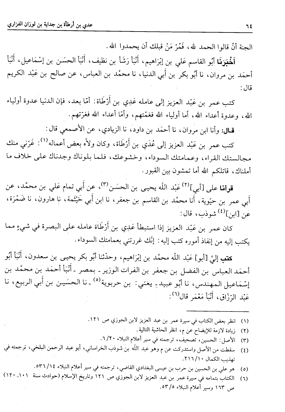 (6) الكتاب بتمامه في سيرة عمر بن عبد العزيز لابن الجوزي ص 121 وتاريخ الاسلام (حوادث سنة 101 - 120) ص 163 وسير أعلام النبلاء 5 / 53