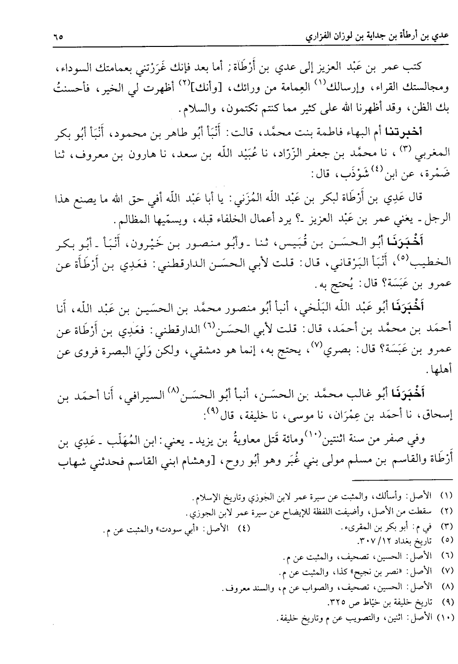 كتب عمر بن عبد العزيز إلى عدي بن أرطاة أما بعد فإنك غررتني بعمامتك السوداء ومجالستك القراء وإرسالك (1) العمامة من ورائك وإنك (2) أظهرت لي الخير فأحسنت بك الظن وقد أظهرنا الله على كثير مما كنتم تكتمون والسلام أخبرتنا أم البهاء فاطمة بنت محمد قالت أنبأ أبو طاهر بن محمود أنبأ أبو بكر المغربي (3) نا محمد بن جعفر الزراد نا عبيد الله بن سعد نا هارون بن معروف ثنا ضمرة عن ابن (4) شوذب قال قال عدي بن أرطاة لبكر بن عبد الله المزني يا أبا عبد الله أفي حق الله ما يصنع هذا الرجل يعني عمر بن عبد العزيز يرد أعمال الخلفاء قبله ويسميها المظالم أخبرنا أبو الحسن بن قبيس ثنا وأبو منصور بن خيرون أنبأ أبو بكر الخطيب (5) أنبأ البرقاني قال قلت لأبي الحسن الدارقطني فعدي بن أرطاة عن عمرو بن عبسة قال يحتج به أخبرنا أبو عبد الله البلخي أنبأ أبو منصور محمد بن الحسين بن عبد الله أنا أحمد بن محمد بن أحمد قال قلت لأبي الحسن (6) الدارقطني فعدي بن أرطاة عن عمرو بن عبسة قال بصري (7) يحتج به إنما هو دمشقي ولكن ولي البصرة فروى عن أهلها أخبرنا أبو غالب محمد بن الحسن أنبأ أبو الحسن (8) السيرافي أنا أحمد بن إسحاق نا أحمد بن عمران نا موسى نا خليفة قال (9) وفي صفر من سنة اثنتين (10) ومائة قتل معاوية بن يزيد يعني ابن المهلب عدي بن أرطاة والقاسم بن مسلم مولى بني غبر وهو أبو روح وهشام ابني القاسم فحدثني شهاب
