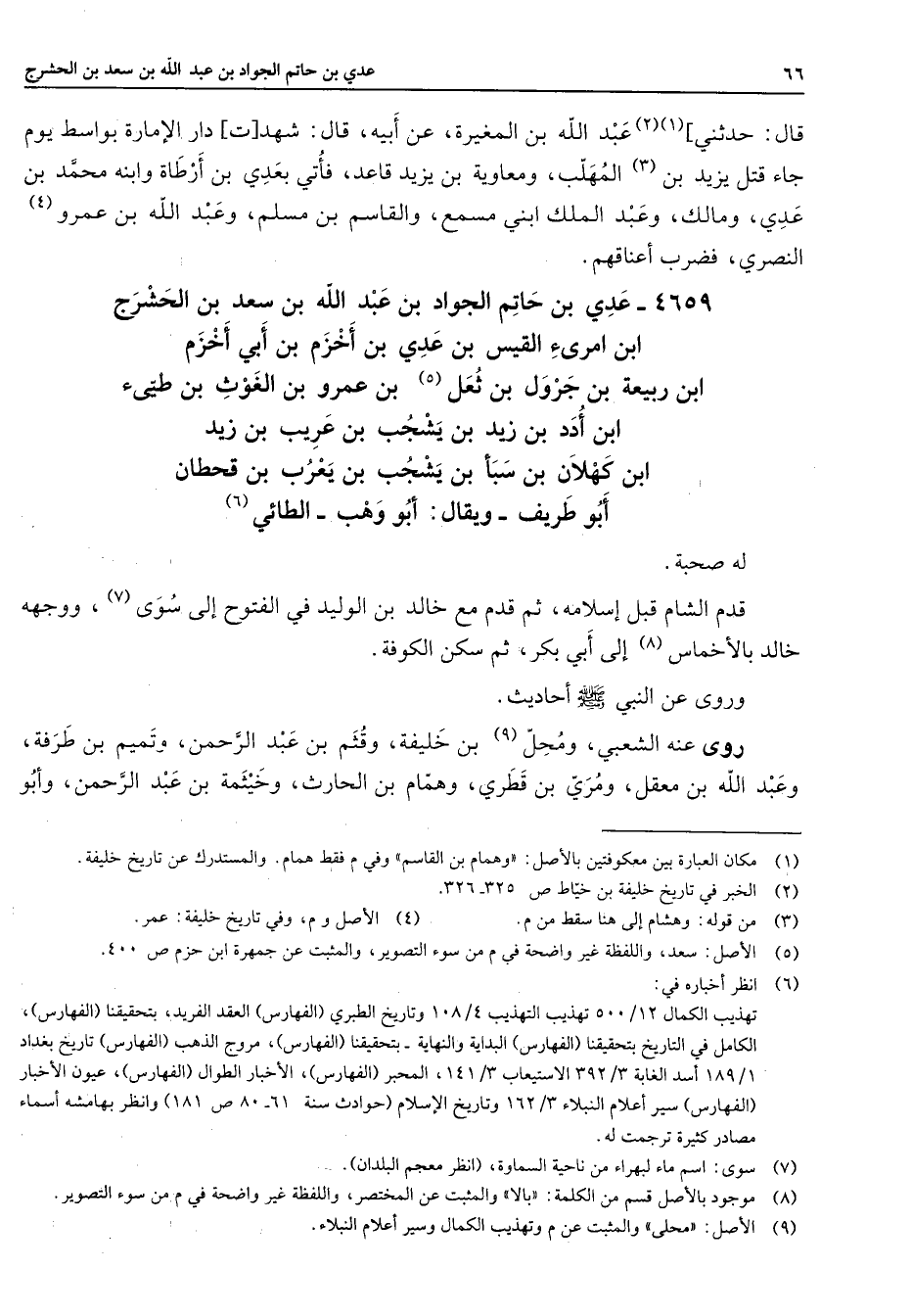 4659 - عدي بن حاتم الجواد بن عبد الله بن سعد بن الحشرج بن امرئ القيس بن عدي بن أخزم بن أبي أخزم بن ربيعة بن جرول بن ثعل (5) بن عمرو بن الغوث بن طيئ بن أدد بن زيد بن يشجب بن عريب بن زيد بن كهلان بن سبأ بن يشجب بن يعرب بن قحطان أبو طريف ويقال أبو وهب الطائي (6) له صحبة قدم الشام قبل إسلامه ثم قدم مع خالد بن الوليد في الفتوح إلى سوى (7) ووجهه خالد بالأخماس (8) إلى ابي بكر ثم سكن الكوفة وروى عن النبي (صلى الله عليه وسلم) أحاديث روى عنه الشعبي ومحل (9) بن خليفة وقثم بن عبد الرحمن وتميم بن طرفة وعبد الله بن معقل ومري بن قطري وهمام بن الحارث وخيثمة بن عبد الرحمن وأبو