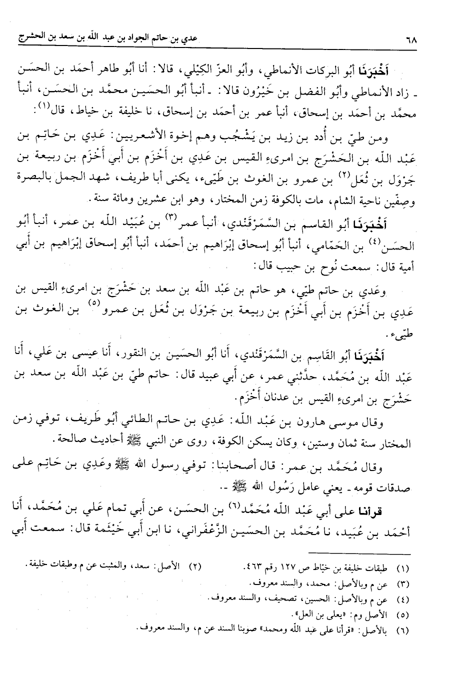 أخبرنا أبو البركات الأنماطي وأبو العز الكيلي قالا أنا أبو طاهر أحمد بن الحسن زاد الأنماطي وأبو الفضل بن خيرون قالا أنبأ أبو الحسين محمد بن الحسن أنبأ محمد بن أحمد بن إسحاق أنبأ عمر بن أحمد بن إسحاق نا خليفة بن خياط قال (1) ومن طي بن أدد بن يشجب وهم إخوة الأشعريين عدي بن حاتم بن عبد الله بن الحشرج بن امرئ القيس بن عدي بن أخزم بن أبي أخزم بن ربيعة بن جرول بن ثعل (2) بن عمرو بن الغوث بن طيئ يكنى أبا طريف شهد الجمل بالبصرة وصفين ناحية الشام مات بالكوفة زمن المختار وهو ابن عشرين ومائة سنة أخبرنا أبو القاسم بن السمرقندي أنبأ عمر (3) بن عبيد الله بن عمر أنبأ أبو الحسن (4) بن الحمامي أنبأ أبو إسحاق إبراهيم بن أحمد أنبأ أبو إسحاق إبراهيم بن ابي أمية قال سمعت نوح بن حبيب قال وعدي بن حاتم طيي هو حاتم بن عبد الله بن سعد بن حشرج بن امرئ القيس بن عدي بن أخزم بن ابي أخزم بن ربيعة بن جرول بن ثعل بن عمرو (5) بن الغوث بن طيئ أخبرنا أبو القاسم بن السمرقندي أنا أبو الحسين بن النقور أنا عيسى بن علي أنا عبد الله بن محمد حدثني عمر عن أبي عبيد قال حاتم طي بن عبد الله بن سعد بن حشرج بن امرئ القيس بن عدنان أخزم وقال موسى هارون بن عبد الله عدي بن حاتم الطائي أبو طريف توفي زمن المختار سنة ثمان وستين وكان يسكن الكوفة روى عن النبي (صلى الله عليه وسلم) أحاديث صالحة وقال محمد بن عمر قال أصحابنا توفى رسول الله (صلى الله عليه وسلم) وعدي بن حاتم على صدقات قومه يعني عامل رسول الله (صلى الله عليه وسلم) قرأنا على أبي عبد الله محمد (6) بن الحسن عن أبي تمام علي بن محمد أنا أحمد بن عبيد نا محمد بن الحسين الزعفراني نا ابن أبي خيثمة قال سمعت أبي