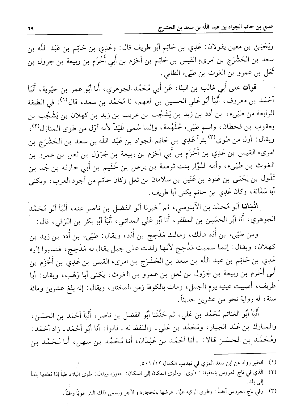 ويحيى بن معين يقولان عدي بن حاتم أبو طريف قال وعدي بن حاتم بن عبد الله بن سعد الحشرج بن امرئ القيس بن حاتم بن أخزم بن ابي أخزم بن ربيعة بن جرول بن ثعل بن عمرو بن الغوث بن طيئ الطائي قرأت على أبي غالب بن البنا عن أبي محمد الجوهري أنا أبو عمر بن حيوية أنبأ أحمد بن معروف أنبأ أبو علي الحسين بن الفهم نا محمد بن سعد قال (1) في الطبقة الرابعة من طيئ بن أدد بن زيد بن يشجب بن عريب بن زيد بن كهلان بن يشجب بن يعقوب بن قحطان واسم طيئ جلهمة وإنما سمي طيئا لأنه أول من طوى المنازل (2) ويقال أول من طوى (3) بئرا عدي بن حاتم الجواد بن عبد الله بن سعد بن الحشرج بن امرئ القيس بن عدي بن أخزم بن أبي أخزم بن ربيعة بن جرول بن ثعل بن عمرو بن الغوث بن طيئ وأمه النوار بنت ثرملة بن يرعل بن خثيم بن ابي حارثة بن جد بن تدول بن يحيى بن عتود بن عنين بن سلامان بن ثعل وكان حاتم من أجود العرب ويكنى أبا سفانة وكان عدي بن حاتم يكنى أبا طريف أنبأنا أبو محمد بن الآبنوسي ثم أخبرنا أبو الفضل بن ناصر عنه أنبأ أبو محمد الجوهري أنا أبو الحسين بن المظفر أنا أبو علي المدائني أنبأ أبو بكر بن البرقي قال ومن طيئ بن أدد مالك ومالك مذحج بن أدد ويقال طيئ بن أدد بن زيد بن كهلان ويقال إنما سميت مذحج لأنها ولدت على جبل يقال له مذحج فنسبوا إليه عدي بن حاتم بن عبد الله بن سعد بن الحشرج بن امرئ القيس بن عدي بن أخزم بن ابي أخزم بن ربيعة بن جرول بن ثعل بن عمرو بن الغوث يكنى أبا وهب ويقال أبا طريف أصيبت عينيه يوم الجمل ومات بالكوفة زمن المختار ويقال إنه بلغ عشرين ومائة سنة له رواية نحو من عشرين حديثا أنبأ أبو الغنائم محمد بن علي ثم حدثنا أبو الفضل بن ناصر أنبأ أحمد بن الحسن والمبارك بن عبد الجبار ومحمد بن علي واللفظ له قالوا أنا أبو أحمد زاد أحمد ومحمد بن الحسن قالا أنا أحمد بن عبدان أنا محمد بن سهل أنا محمد بن