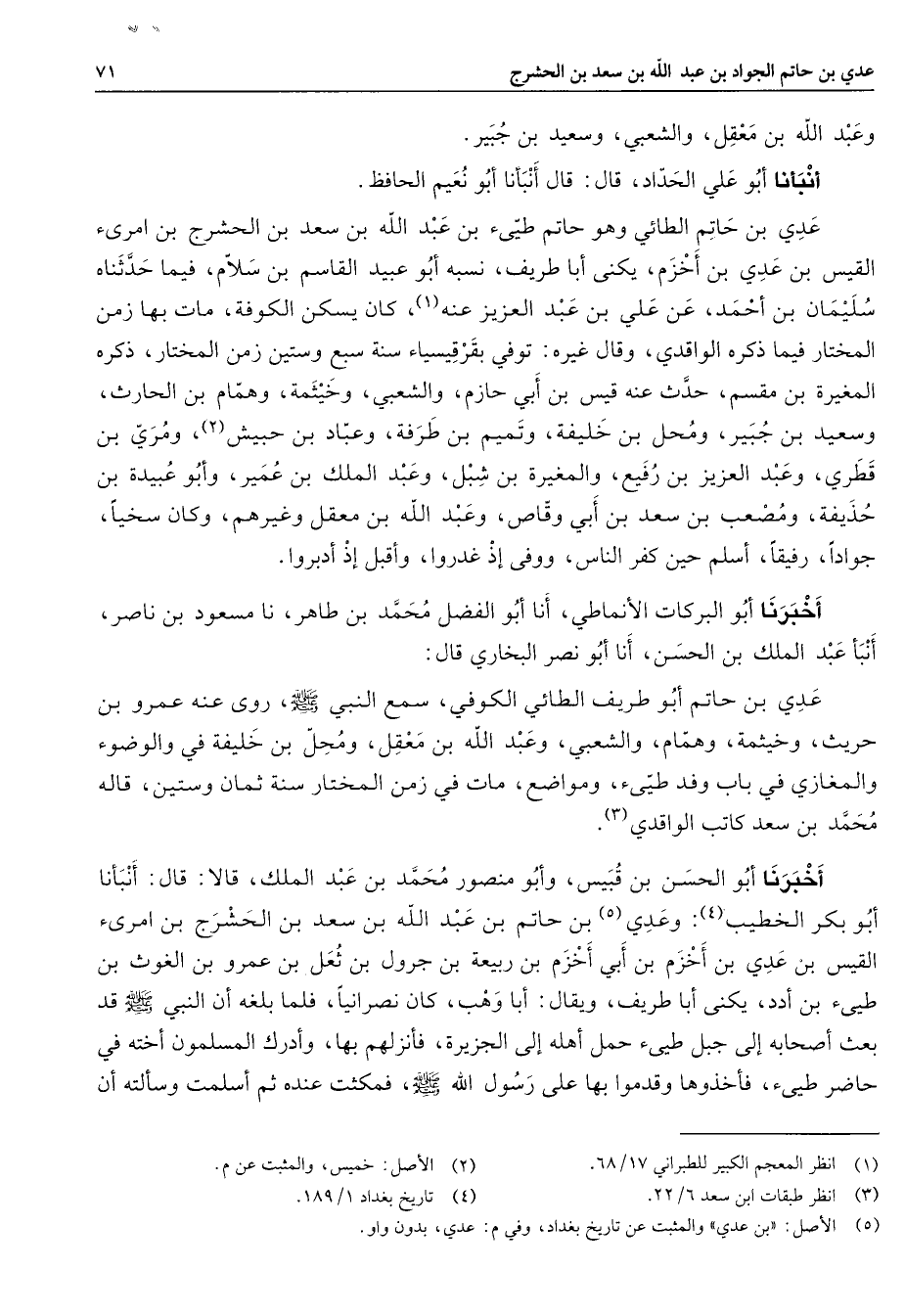 وعبد الله بن معقل والشعبي وسعيد بن جبير أنبأنا أبو علي الحداد قال قال أنبأنا أبو نعيم الحافظ عدي بن حاتم الطائي وهو حاتم طيئ بن عبد الله بن سعد بن الحشرج بن امرئ القيس بن عدي بن أخزم يكنى أبا طريف نسبه أبو عبيد القاسم بن سلام فيما حدثناه سليمان بن أحمد عن علي بن عبد العزيز عنه (1) كان يسكن الكوفة مات بها زمن المختار فيما ذكره الواقدي وقال غيره توفي بقرقيسياء سنة سبع وستين زمن المختار ذكره المغيرة بن مقسم حدث عنه قيس بن أي حازم والشعبي وخيثمة وهمام بن الحارث اوسعيد بن جبير ومحل بن خليفة وتميم بن طرفة وعباد بن حبيش (2) ومري بن قطري وعبد العزيز بن رفيع والمغيرة بن شبل وعبد الملك بن عمير وأبو عبيدة بن حذيفة ومصعب بن سعد بن أبي وقاص وعبد الله بن معقل وغيرهم وكان سخيا جوادا رفيقا أسلم حين كفر الناس ووفى إذ غدروا وأقبل إذ أدبروا أخبرنا أبو البركات الأنماطي أنا أبو الفضل محمد بن طاهر نا مسعود بن ناصر أنبأ عبد الملك بن الحسن أنا أبو نصر البخاري قال عدي بن حاتم أبو طريف الطائي الكوفي سمع النبي (صلى الله عليه وسلم) روى عنه عمرو بن حريث وخيثمة وهمام والشعبي وعبد الله بن معقل ومحل بن خليفة في الوضوء والمغازي في باب وفد طيئ ومواضع مات في زمن المختار سنة ثمان وستين قاله محمد بن سعد كاتب الواقدي (3) أخبرنا أبو الحسن بن قبيس وأبو منصور أحمد بن عبد الملك قالا قال أنبأنا أبو بكر الخطيب (4) وعدي (5) بن حاتم بن عبد الله بن سعد بن الحشرج بن امرئ القيس بن عدي بن أخزم بن أبي أخزم بن ربيعة بن جرول بن ثعل بن عمرو بن الغوث بن طيئ بن أدد يكنى أبا طريف ويقال أبا وهب كان نصرانيا فلما بلغه أن النبي (صلى الله عليه وسلم) قد بعث أصحابه إلى جبل طيئ حمل أهله إلى الجزيرة فأنزلهم بها وأدرك المسلمون أخته في حاضر طيئ فأخذوها وقدموا بها على رسول الله (صلى الله عليه وسلم) فمكثت عند ثم أسلمت وسألته أن