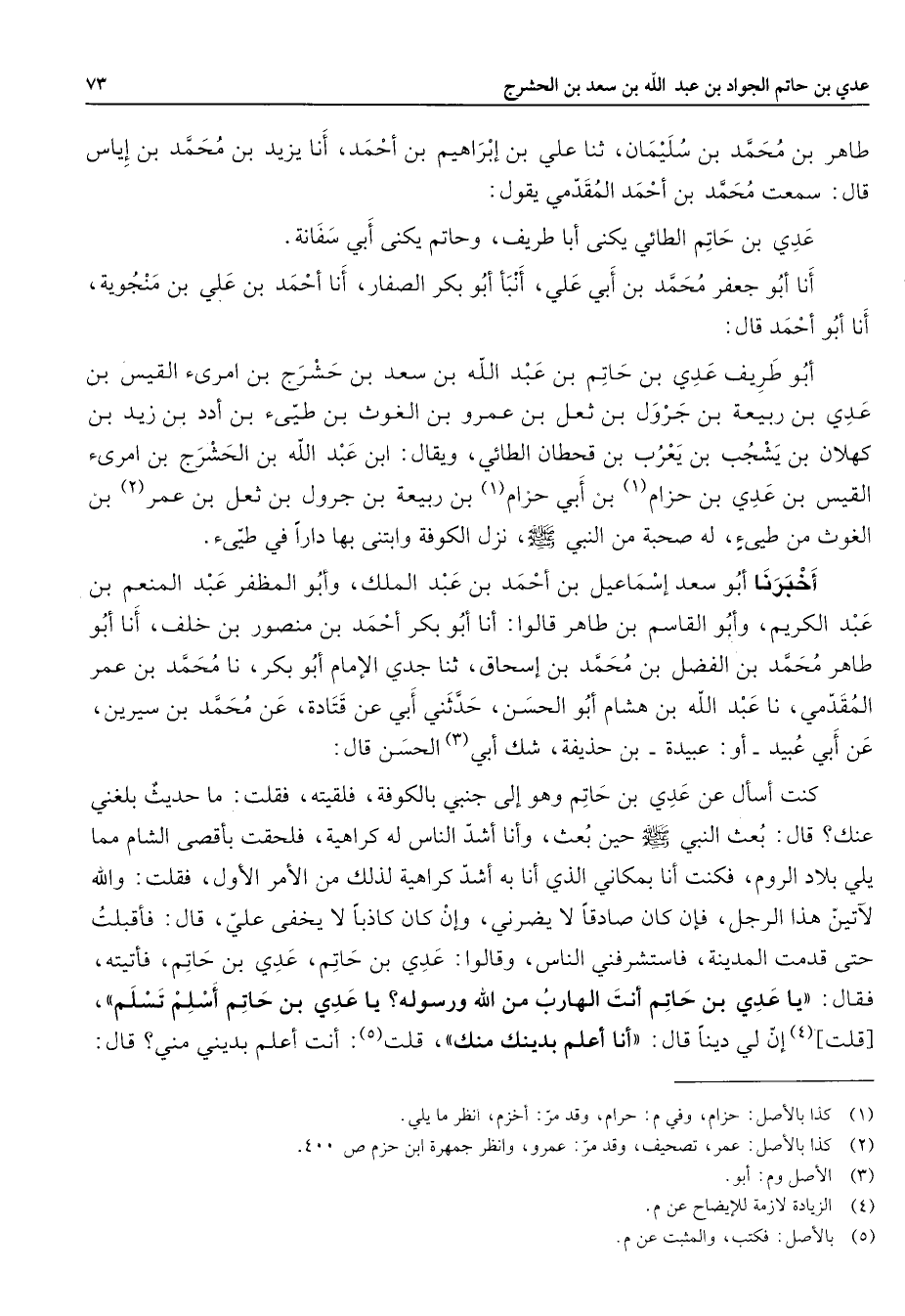 طاهر بن محمد بن سليمان ثنا علي بن إبراهيم بن أحمد أنا يزيد بن محمد بن إياس قال سمعت محمد بن أحمد المقدمي يقول عدي بن حاتم الطائي يكنى أبا طريف وحاتم يكنى أبي سفانة أنا أبو جعفر محمد بن أبي علي أنبأ أبو بكر الصفار أنا أحمد بن علي بن منجوية أنا أبو أحمد قال أبو طريف عدي بن حاتم بن عبد الله بن سعد بن حشرج بن أمرئ القيس بن عدي بن ربيعة بن جرول بن ثعل بن عمرو بن الغوث بن طيئ بن أدد بن زيد بن كهلان بن يشجب بن يعرب بن قحطان الطائي ويقال ابن عبد الله بن الحشرج بن امرئ القيس بن عدي بن حزام (1) بن أبي حزام (1) بن ربيعة بن جرول بن ثعل بن عمر (2) بن الغوث بن طيئ له صحبة من النبي (صلى الله عليه وسلم) نزل الكوفة وابتنى بها دارا في طيئ أخبرنا أبو سعد إسماعيل بن أحمد بن عبد الملك وأبو المظفر عبد المنعم بن عبد الكريم وأبو القاسم بن طاهر قالوا أنا أبو بكر أحمد بن منصور بن خلف أنا أبو طاهر محمد بن الفضل بن محمد بن إسحاق ثنا جدي الإمام أبو بكر نا محمد بن عمر المقدمي نا عبد الله بن هشام أبو الحسن حدثني أبي عن قتادة عن محمد بن سيرين عن أبي عبيد أو عبيدة بن حذيفة شك أبي (3) الحسن قال كنت أسأل عن عدي بن حاتم وهو إلى جنبي بالكوفة فلقيته فقلت ما حديث بلغني عنك قال بعث النبي (صلى الله عليه وسلم) حين بعث وأنا أشد الناس له كراهية فلحقت بأقصى الشام مما يلي بلاد الروم فكنت أنا بمكاني الذي أنا به أشد كراهية لذلك من الأمر الأول فقلت والله لآتين هذا الرجل فإن كان صادقا لا يضرني وإن كان كاذبا لا يخفى علي قال فأقبلت حتى قدمت المدينة فاستشرفني الناس وقالوا عدي بن حاتم عدي بن حاتم فأتيته فقال يا عدي بن حاتم أنت الهارب من الله ورسوله يا عدي بن حاتم أسلم تسلم قلت (4) إن لي دينا قال أنا أعلم بدينك منك قلت (5) أنت أعلم بديني مني قال