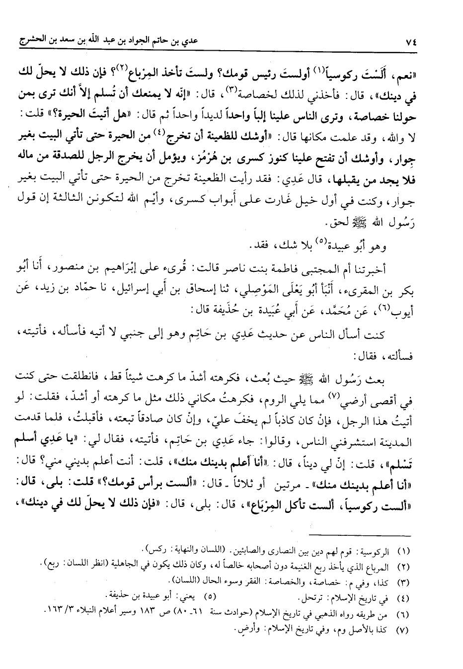 نعم ألست ركوسيا (1) أو لست رئيس قومك ولست تأخذ المرباع (2) فإن ذلك لا يحل لك في دينك قال فأخذني لذلك لخصاصة (3) قال إنه لا يمنعك أن تسلم إلا أنك ترى بمن حولنا خصاصة وترى الناس علينا إلبا واحدا لديدا واحدا ثم قال هل أتيت الحيرة قلت لا والله وقد علمت مكانها قال أوشك للظعينة أن تخرج (4) من الحيرة حتى تأتي البيت بغير جوار وأوشك أن تفتح علينا كنوز كسرى بن هرمز ويؤمل أن يخرج الرجل للصدقة من ماله فلا يجد من يقبلها قال عدي فقد رأيت الظعينة تخرج من الحيرة حتى تأتي البيت بغير جوار وكنت في أول خيل غارت على أبواب كسرى وأيم الله لتكونن الثالثة إن قول رسول الله (صلى الله عليه وسلم) لحق وهو أبو عبيدة (5) بلا شك فقد أخبرتنا أم المجتبى فاطمة بنت ناصر قالت قرئ على إبراهيم بن منصور أنا أبو بكر بن المقرئ أنبأ أبو يعلى الموصلي ثنا إسحاق بن أبي إسرائيل نا حماد بن زيد عن أيوب (6) عن محمد عن أبي عبيدة بن حذيفة قال كنت أسأل الناس عن حديث عدي بن حاتم وهو إلى جنبي لا أتيه فأسأله فأتيته فسألته فقال بعث رسول الله (صلى الله عليه وسلم) حيث بعث فكرهته أشد ما كرهت شيئا قط فانطلقت حتى كنت في أقصى أرضي (7) مما يلي الروم فكرهت مكاني ذلك مثل ما كرهته أو أشد فقلت لو أتيت هذا الرجل فإن كان كاذبا لم يخف علي وإن كان صادقا تبعته فأقبلت فلما قدمت المدينة استشرفني الناس وقالوا جاء عدي بن حاتم فأتيته فقال لي يا عدي أسلم تسلم قلت إن لي دينا قال أنا أعلم بدينك منك قلت أنت أعلم بديني مني قال أنا أعلم بدينك منك مرتين أو ثلاثا قال ألست برأس قومك قلت بلى قال ألست ركوسيا ألست تأكل المرباع قال بلى قال فإن ذلك لا يحل لك في دينك