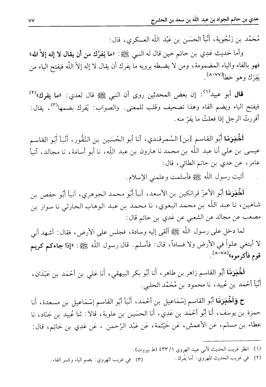[8077] قال أبو عبيد (1) إن بعض المحدثين روى أن النبي (صلى الله عليه وسلم) قال لعدي ما يفرك (2) فيفتح الياء ويضم الفاء وهذا تصحيف وقلب للمعنى والصواب يفرك بضهما (3) يقال أفررت الرجل إذا فعلت ما يفر منه أخبرنا أبو القاسم بن السمرقندي أنا أبو الحسين بن النقور أنبأ أبو القاسم عيسى بن علي أنا عبد الله بن محمد نا هارون بن عبد الله نا أبو أسامة نا مجالد أنبأ عامر عن عدي بن حاتم الطائي قال أتيت رسول الله (صلى الله عليه وسلم) فأسلمت وعلمني الإسلام أخبرنا أبو الأعز قراتكين بن الأسعد أنبأ أبو محمد الجوهري أنبأ أبو حفص بن شاهين نا عبد الله بن محمد البغوي نا محمد بن عبد الوهاب الحارثي نا سوار بن مصعب عن مجالد عن الشعبي عن عدي بن حاتم قال لما دخل على رسول الله (صلى الله عليه وسلم) ألقى إليه وسادة فجلس على الأرض فقال أشهد أني لا أبتغي علوا في الأرض ولا فسادا قال فاسلم قال رسول الله (صلى الله عليه وسلم) إذا جاءكم كريم قوم فأكرموه