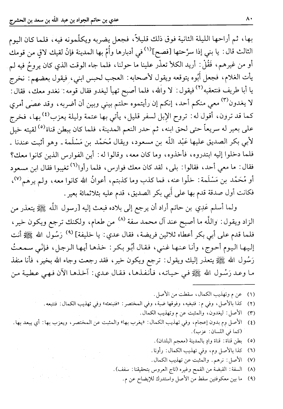 بها ثم أراحها الليلة الثانية فوق ذلك قليلا فجعل يضربه ويكلمونه فيه فلما كان اليوم الثالث قال يا بني إذا سرحتها فصح (1) في أدبارها وأم بها المدينة فإن لقيك لاق من قومك أو من غيرهم فقل أريد الكلأ تعذر علينا ما حولنا فلما جاء الوقت الذي كان يروح فيه لم يأت الغلام فجعل أبوه يتوقعه ويقول لأصحابه العجب لحبس ابني فيقول بعضهم نخرج يا أبا طريف فنتعقبه (2) فيقول لا والله فلما أصبح تهيأ ليغدو فقال قومه نغدو معك فقال لا يغدون (3) معي منكم أحد إنكم إن رأيتموه حلتم بيني وبين أن أضربه وقد عصى أمري كما قد ترون أقول له تروح الإبل لسفر قليل يأتي بها عتمة وليلة يعزب (4) بها فخرج على بعير له سريعا حتى لحق ابنه ثم حدر النعم المدينة فلما كان ببطن قناة (5) لقيته خيل لأبي بكر الصديق عليها عبد الله بن مسعود ويقال محمد بن مسلمة وهو أثبت عندنا فلما دخلوا إليه ابتدروه فأخذوه وما كان معه وقالوا له أين الفوارس الذين كانوا معك فقال ما معي أحد فقالوا بلى لقد كان معك فوارس فلما رأوا (6) تغيبوا فقال ابن مسعود أو محمد بن مسلمة خلوا عنه فما كذب وما كذبتم أعوان الله كانوا معه ولم يرهم (7) فكانت أول صدقة قدم بها على أبي بكر الصديق قدم عليه بثلاثمائة بعير ولما أسلم عدي بن حاتم أراد أن يرجع إلى بلاده فبعث إليه رسول الله (صلى الله عليه وسلم) يتعذر من الزاد ويقول والله ما أصبح عند آل محمد سفة (8) من طعام ولكنك ترجع ويكون خير فلما قدم على أبي بكر أعطاه ثلاثين فريضة فقال عدي يا خليفة (9) رسول الله (صلى الله عليه وسلم) أنت إليها اليوم أحوج وأنا عنها غني فقال أبو بكر خذها أيها الرجل فإني سمعت رسول الله (صلى الله عليه وسلم) يتعذر إليك ويقول ترجع ويكون خير فقد رجعت وجاء الله بخير فأنا منفذ ما وعد رسول الله (صلى الله عليه وسلم) في حياته فأنفذها فقال عدي آخذها الآن فهي عطية من