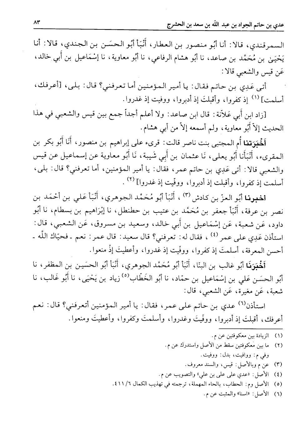 السمرقندي قالا أنا أبو منصور بن العطار أنبأ أبو الحسن بن الجندي قالا أنا يحيى بن محمد بن صاعد نا أبو هشام الرفاعي نا أبو معاوية نا إسماعيل بن أبي خالد عن قيس والشعبي قالا أتى عدي بن حاتم فقال يا أمير المؤمنين أما تعرفني قال بلى أعرفك أسلمت (1) إذ كفروا وأقبلت إذ أدبروا ووفيت إذ غدروا زاد ابن أبي علانة قال ابن صاعد ولا أعلم أحدا جمع بين قيس والشعبي في هذا الحديث إلا أبو معاوية ولم أسمعه إلا من أبي هشام أخبرتنا أم المجتبى بنت ناصر قالت قرئ على إبراهيم بن منصور أنا أبو بكر بن المقرئ أنبأنا أبو يعلى نا عثمان بن ابي شيبة نا أبو معاوية عن إسماعيل عن قيس والشعبي قالا أتى عدي بن حاتم عمر فقال يا أمير المؤمنين أما تعرفني قال بلى أسلمت إذ كفروا وأقبلت إذ أدبروا ووفيت إذ غدروا (2) أخبرنا أبو العز بن كادش (3) أنبأ أبو محمد الجوهري أنبأ علي بن أحمد بن نصر بن عرفة أنبأ جعفر بن محمد بن عتيب بن حطنطل نا إبراهيم بن بسطام نا أبو داود عن شعبة عن إسماعيل بن أبي خالد وسعيد بن مسروق عن الشعبي قال استأذن عدي على عمر (4) فقال له تعرفني قال سعيد قال عمر نعم فحياك الله أحسن المعرفة أسلمت إذ كفروا ووفيت إذ غدروا وأعطيت إذ منعوا أخبرنا أبو غالب بن البنا أنبأ أبو محمد الجوهري أنبأ أبو الحسين بن المظفر نا أبو الحسن علي بن إسماعيل بن حماد نا أبو الخطاب (5) زياد بن يحيى نا أبو غالب نا شعبة عن مغيرة عن الشعبي قال استأذن (6) عدي بن حاتم على عمر فقال يا أمير المؤمنين أتعرفني قال نعم أعرفك أقبلت إذ أدبروا ووفيت وغدروا وأسلمت وكفروا وأعطيت ومنعوا
