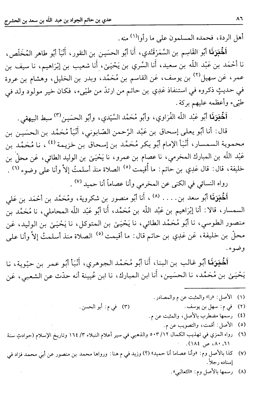 أهل الردة فحمده المسلمون على ما رأوا (1) منه أخبرنا أبو القاسم بن السمرقندي أنا أبو الحسين بن النقور أنبأ أبو طاهر المخلص نا أحمد بن عبد الله بن سعيد أنا السري بن يحيى أنا شعيب بن إبراهيم نا سيف بن عمر عن سهيل (2) بن يوسف عن القاسم بن محمد وبدر بن الخليل وهشام بن عروة في حديث ذكروه في استنفاذ عدي بن حاتم من ارتد من طيئ فكان خير مولود ولد في طيئ وأعظمه عليهم بركة أخبرنا أبو عبد الله الفراوي وأبو محمد السيدي وأبو الحسين (3) سبط البيهقي قال أنا أبو يعلى إسحاق بن عبد الرحمن الصابوني أنبأ محمد بن الحسين بن محموية السمسار أنبأ الإمام أبو بكر محمد بن إسحاق بن خزيمة (4) انا محمد بن عبد الله بن المبارك المخرمي نا عصام بن عمرو نا يحيى بن الوليد الطائي عن محل بن خليفة قال قال عدي بن حاتم ما أقيمت (5) الصلاة منذ أسلمت إلا وأنا على وضوء (6) رواه النسائي في الكنى عن المخرمي وأنا عصاما أنا حميد (7) أخبرنا أبو سعد بن (8) أنا أبو منصور بن شكروية ومحمد بن أحمد بن علي السمسار قالا أنا إبراهيم بن عبد الله بن محمد أنا أبو عبد الله المحاملي نا محمد بن منصور الطوسي نا أبو محمد الطائي نا يحيى بن المتوكل نا يحيى بن الوليد عن محل بن خليفة عن عدي بن حاتم قال ما أقيمت (5) الصلاة منذ أسلمت إلا وأنا على وضوء أخبرنا أبو غالب بن البنا أنا أبو محمد الجوهري أنبأ أبو عمر بن حيوية نا يحيى بن محمد نا الحسين أنا ابن المبارك نا ابن عيينة أنه حدث عن الشعبي عن