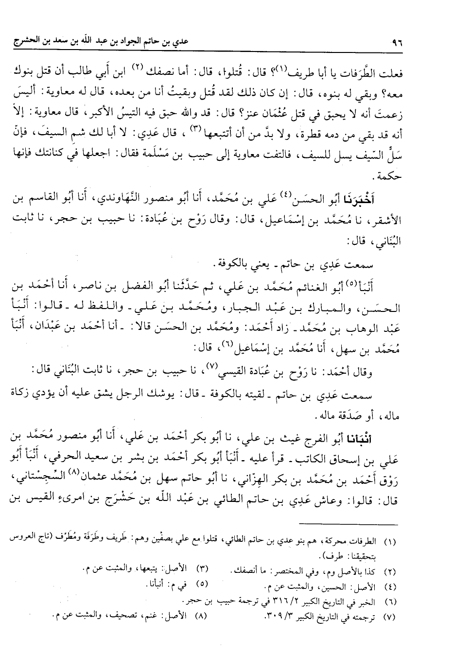 فعلت الطرفات يا أبا طريف (1) قال قتلوا قال أما نصفك (2) ابن أبي طالب أن قتل بنوك معك وبقي له بنوه قال إن كان ذلك لقد قتل وبقيت أنا من بعده قال له معاوية أليس زعمت أنه لا يحبق في قتل عثمان عنز قال قد والله حبق في التيس الأكبر قال معاوية إلا أنه قد بقي من دمه قطره ولا بد من أن أتتبعها (3) قال عدي لا أبا لك شم السيف فإن سل السيف يسل للسيف فالتفت معاوية إلى حبيب بن مسلمة فقال اجعلها في كنانتك فإنها حكمة أخبرنا أبو الحسن (4) علي بن محمد أنا أبو منصور النهاوندي أنا أبو القاسم بن الأشقر نا محمد بن إسماعيل قال وقال روح بن عبادة نا حبيب بن حجر نا ثابت البناني قال سمعت عدي بن حاتم يعني بالكوفة أنبأ (5) أبو الغنائم محمد بن علي ثم حدثنا أبو الفضل بن ناصر أنا أحمد بن الحسن والمبارك بن عبد الجبار ومحمد بن علي واللفظ له قالوا أنبأ عبد الوهاب بن محمد زاد أحمد ومحمد بن الحسن قالا أنا أحمد بن عبدان أنبأ محمد بن سهل أنا محمد بن إسماعيل (6) قال وقال أحمد نا روح بن عبادة القيسي (7) نا حبيب بن حجر نا ثابت البناني قال سمعت عدي بن حاتم لقيته بالكوفة قال يوشك الرجل يشق عليه أن يؤدي زكاة ماله أو صدقة ماله أنبأنا أبو الفرج غيث بن علي نا أبو بكر أحمد بن علي أنا أبو منصور محمد بن علي بن إسحاق الكاتب قرأ عليه أنبأ أبو بكر أحمد بن بشر بن سعيد الحرفي أنبأ أبو روق أحمد بن محمد بن بكر الهزاني نا أبو حاتم سهل بن محمد عثمان (8) السجستاني قال قالوا وعاش عدي بن حاتم الطائي بن عبد الله بن حشرج بن امرئ القيس بن