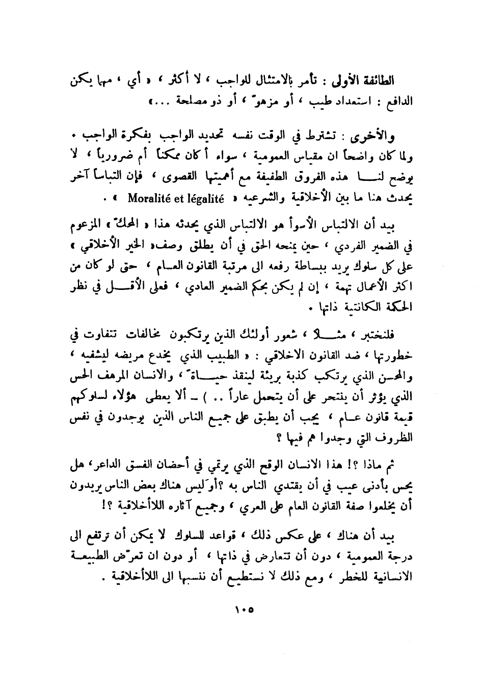 ولما كان واضحًا أن مقياس العمومية، سواء أكان ممكنًا أم ضروريًّا، لا يوضح لنا هذه الفروق الطفيفة مع أهميتها القصوى، فإن التباسًا آخر يحدث هنا ما بين الأخلاقية والشرعية "moralite et legalite".