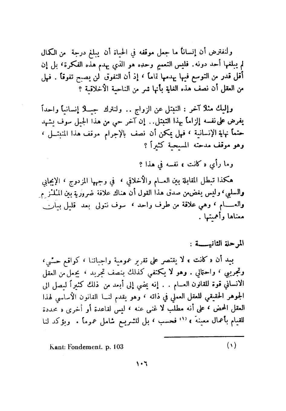 بيد أن "كانت" لا يقتصر على تقرير عمومية واجباتنا، كواقع حسي، وتجريبي، واحتمالي. وهو لا يكتفي كذلك بنصف تجريد، يجعل من العقل الإنساني قوة للقانون العام ... إنه يمضي إلى أبعد من ذلك كثيرًا ليصل إلى الجوهر الحقيقي للعقل العملي في ذاته، وهو يقدم لنا القانون الأساسي لهذا العقل المحض، على أنه مطلب لا غنى عنه، ليس لقاعدة أو أخرى "محددة للقيام بأعمال معينة"1 فحسب، بل لتشريع شامل عمومًا. ويؤكد لنا.