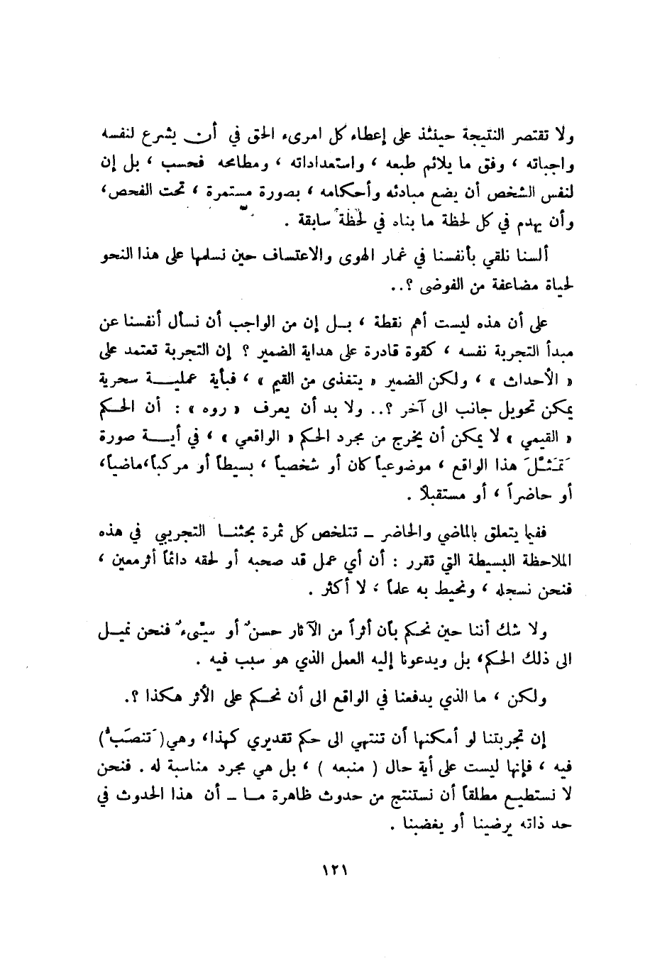 ولا تقتصر النتيجة حينئذ على إعطاء كل امرئ الحق في أن يشرع لنفسه واجباته، وفق ما يلائم طبعه، واستعداداته، ومطامحه فحسب، بل إن لنفس الشخص أن يضع مبادئه وأحكامه، بصورة مستمرة، تحت الفحص، وأن يهدم في كل لحظة ما بناه في لحظة سابقة.