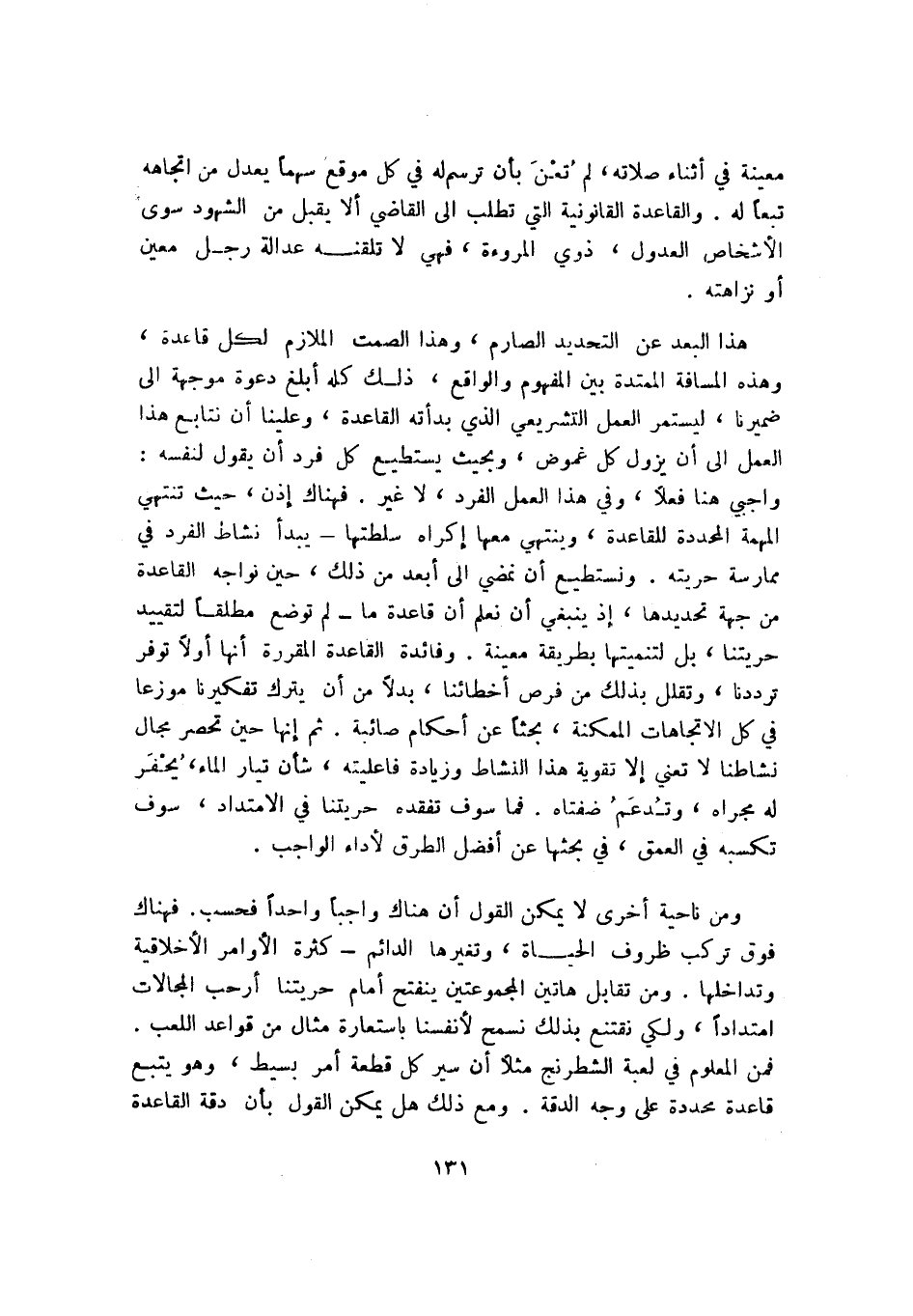 هذا البعد عن التحديد الصارم، وهذا الصمت الملازم لكل قاعدة وهذه المسافة الممتدة بين المفهوم والواقع، ذلك كله أبلغ دعوة موجهة إلى ضميرنا؛ ليستمر العمل التشريعي الذي بدأته القاعدة، وعلينا أن نتابع هذا العمل إلى أن يزول كل غموض، وبحيث يستطيع كل فرد أن يقول لنفسه: واجبي هنا فعلًا، وفي هذا العمل الفرد، لا غير. فهناك إذن، حيث تنتهي المهمة المحددة للقاعدة، وينتهي معها إكراه سلطتها -يبدأ نشاط الفرد في ممارسة حريته. ونستطيع أن نمضي إلى أبعد من ذلك، حين نواجه القاعدة من جهة تحديدها، إذ ينبغي أن نعلم أن قاعدة ما -لم توضع مطلقًا لتقييد حريتنا، بل لتنميتها بطريقة معينة. وفائدة القاعدة المقررة أنها أولًا توفر ترددنا، وتقلل بذلك من فرص أخطائنا، بدلًا من أن يترك تفكيرنا موزعًا في كل الاتجاهات الممكنة، بحثًا عن أحكام صائبة. ثم إنها حين تحصر مجال ناشطنا لا تعني إلا تقوية هذا النشاط وزيادة فاعليته، شأن تيار الماء، يحفر له مجراه، وتدعم ضفتاه. فما سوف تفقده حريتنا في الامتداد، سوف تكسبه في العمق، في بحثها عن أفضل الطرق لأداء الواجب.