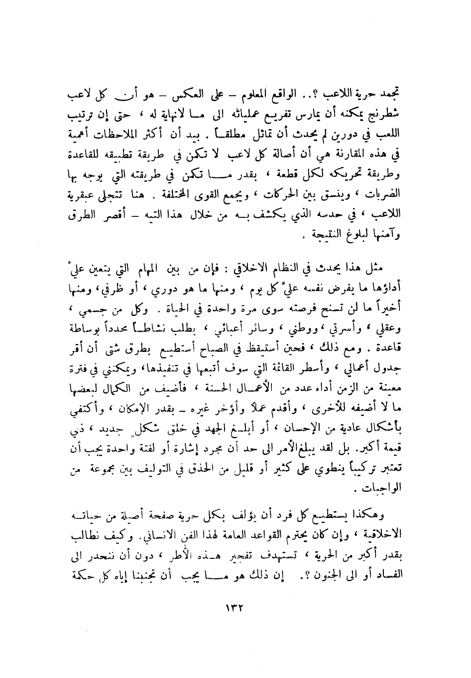 تجمد حرية اللاعب؟ ... الواقع المعلوم -على العكس- هو أن كل لاعب شطرنج يمكنه أن يمارس تفريع عملياته إلى ما لا نهاية له، حتى إن ترتيب اللعب في دورين لم يحدث أن تماثل مطلقًا. بيد أن أكثر الملاحظات أهمية في هذه المقارنة هي أن أصالة كل لاعب لا تكمن في طريقة تطبيقه للقاعدة وطريقة تحريكه لكل قطعة، بقدر ما تكمن في طريقته التي يوجه بها الضربات، وينسق بين الحركات، ويجمع القوى المختلفة. هنا تتجلى عبقرية اللاعب، في حدسه الذي يكشف به من خلال هذا التيه -أقصر الطرق وآمنها لبلوغ النتيجة.